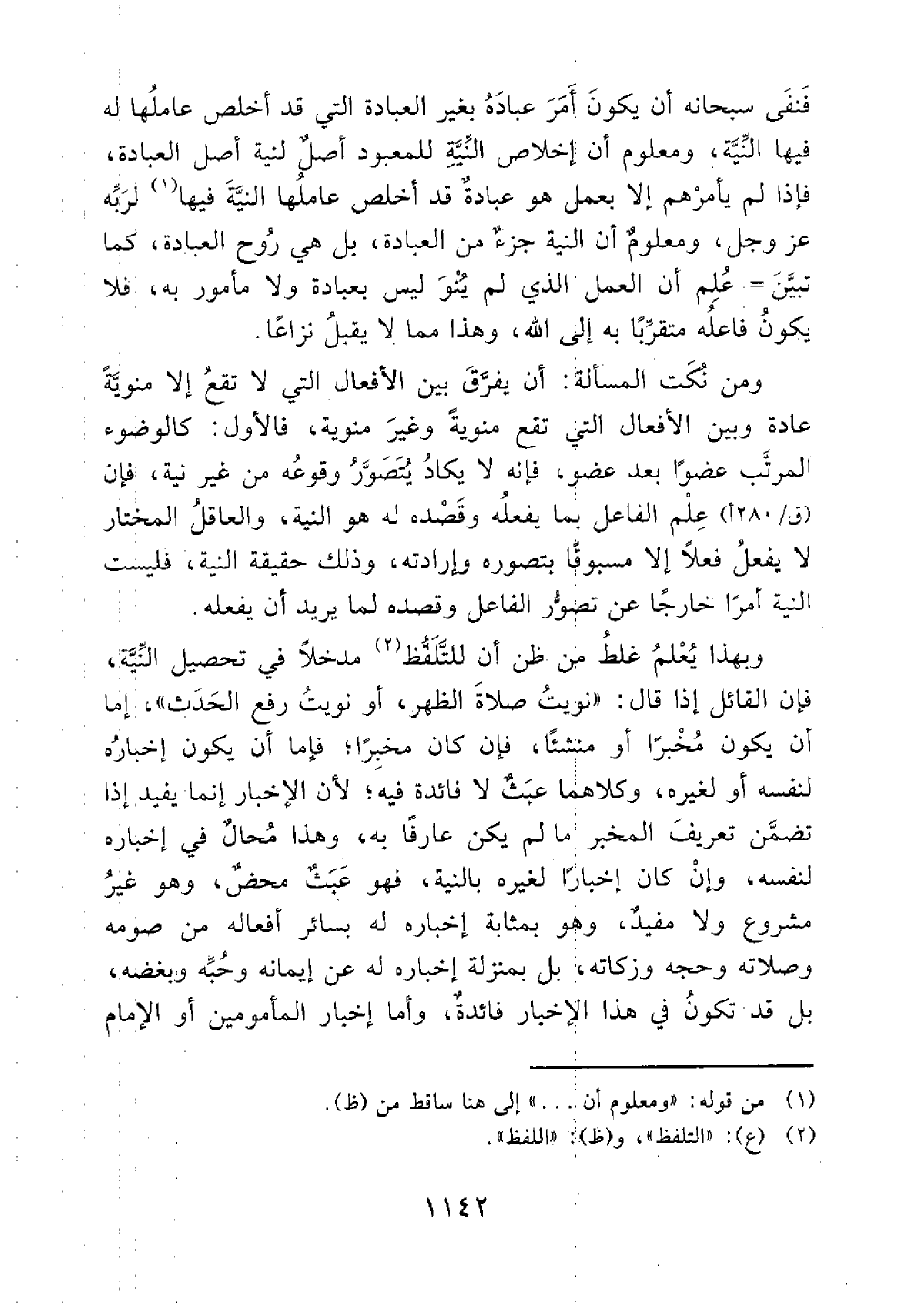 ومن نكت المسألة أن يفرق بين الأفعال التي لا تقع إلا منوية عادة وبين الأفعال التي تقع منوية وغير منوية فالأولى كالوضوء المرتب عضوا بعد عضو فإنه لا يكاد يتصوروقوعه من غير نية فإن علم الفاعل بما يفعله وقصده له هو النية والعاقل المختار لا يفعل فعلا إلا مسبوقا بتصوره وإرادته وذلك حقيقة النية فليست النية أمرا خارجا عن تصور الفاعل وقصده لما يريد أن يفعله وبهذا يعلم غلط من ظن أن الملتفظ مدخلا في تحصيل النية فإن القائل إذا قال نويت صلاة الظهر أو نويت رفع الحدث إما أن يكون مخبرا أو منشأفإن كان مخبرا فإما أن يكون إخباره لنفسه أو لغيره وكلاهما عبث لا فائدة فيه لأن الاخبار إنما يفيد أذا تضمن تعريف المخبر ما لم يكن عارفا به وهذا محال في إخباره لنفسه وإن كان إخبارا لغيره بالنية فهو عبث محض وهو غير مشروع ولا مفيد وهو بمثابة إخباره له بسائر افعاله من صومة وصلاته وحجة وزكاته بل بمنزلة إخباره له ايمانه عن وحبة وبغضه بل قد يكون في هذا الإخبار فائدة وأما إخبار المأمومين أو الإمام@