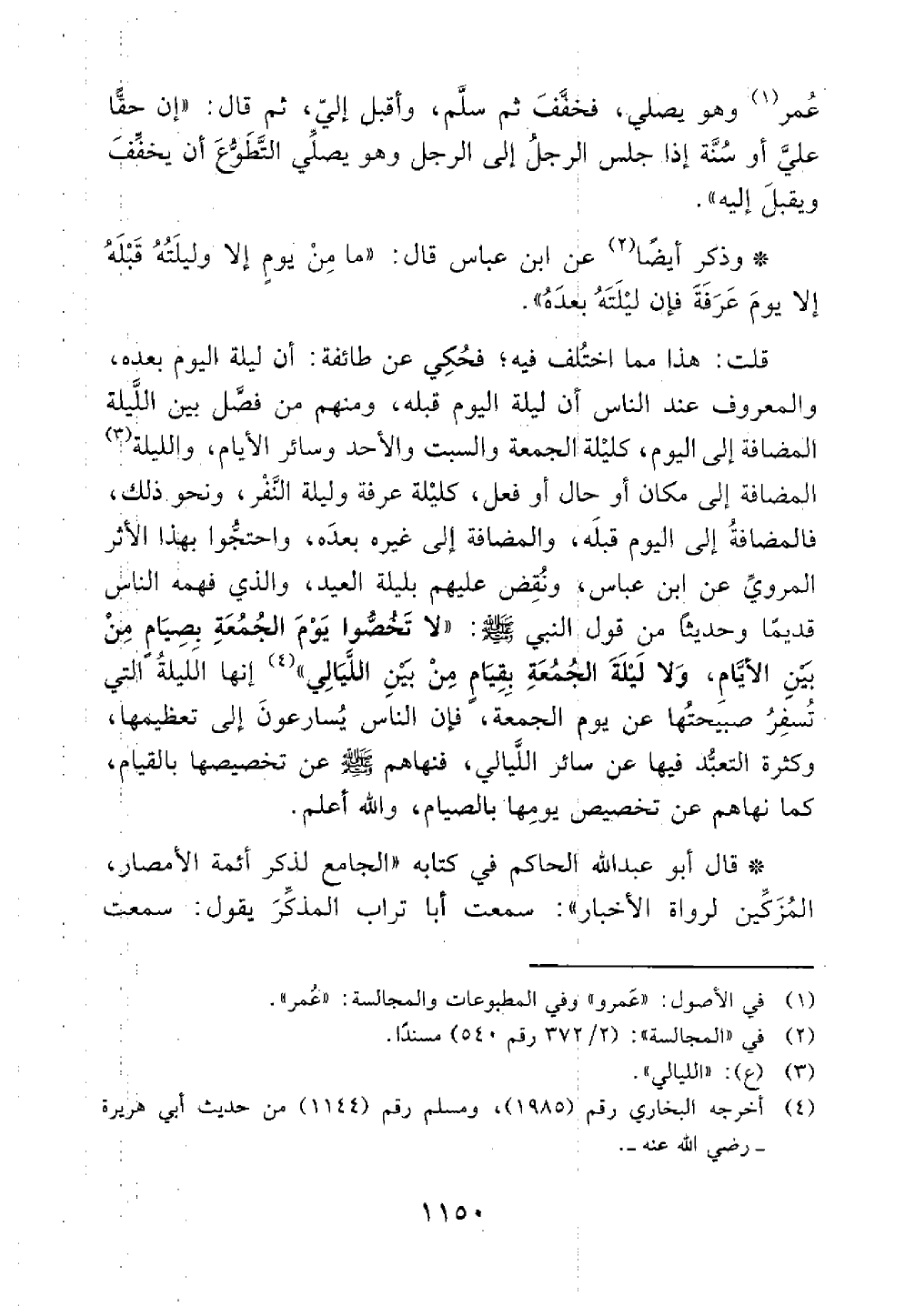 أن ليلة اليوم قبله ومنهم من فصل بين الليلة المضافة إلى اليوم كليلة الجمعة والسبت والأحد وسائر لأيام والليلة المضافة إلى مكان أو حال أو فعل كليلة عرفة وليلة النفر ونحو ذلك فالمضافة إلى اليوم قبله والمضافة إلى غيره بعده واحتجوا له بهذا الاثر المروي عن أبن عباس ونقض عليهم بليلة العيد والذي فهمه الناس قديما وحديثا من قول النبي تخصوا يوم الجمعة بصيام من بين الأيام ولا ليلة الجمعة بقيام من بين الليالي // رواه مسلم وأبو داود والترمذي // أنها الليلة التي تسفر صبيحتها عن يوم الجمعة فإن الناس يسارعون إلى تعظيمها وكثرة التعبد فيها عن سائر الليالي فنهاهم تخصيصها بالقيام كما نهاهم عن تخصيص يومها بالصيام والله أعلم
