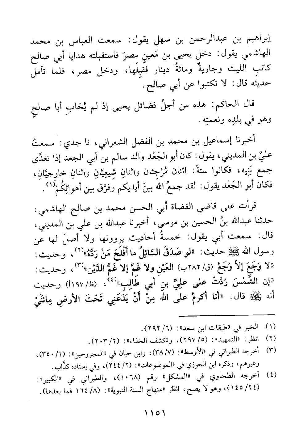 إبراهيم بن عبد الرحمن بن سهل يقول سمعت العباس بن محمد الهاشمي يقول دخل يحيى بن معين مصر فاستقبلته هدايا أبي صالح كاتب الليث وجارية ومائة دينار فقبلها ودخل مصر فلما تأمل حديثه قال لا تكتبوا عن أبي صالح قال الحاكم هذه من أجل فضائل يحيى إذ لم يحاب أبا صالح وهو في بلده ونعمته
