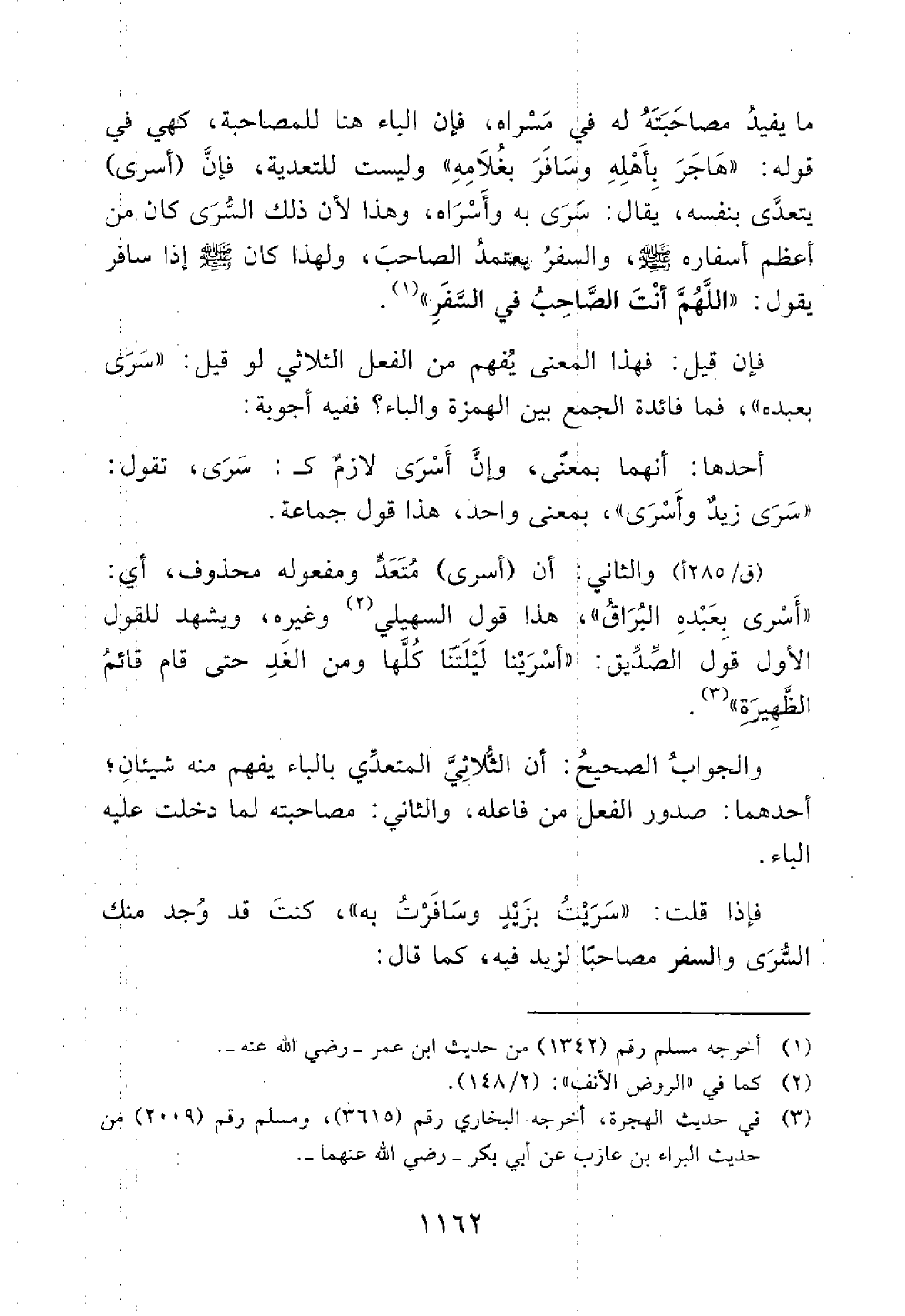 ما يفيد مصاحبته له في مسراه فإن الباء هنا للمصاحبة كالهاء في قوله هاجر بأهله وسافر بغلامه وليست للتعدية فإن أسرى يتعدى بنفسه يقال سري به وأسراه وهذا لأن ذلك السري كان أعظم أسفاره والسفر يعتمد الصاحب ولهذا كان سافر يقول اللهم أنت الصاحب في السفر // رواه مسلم والترمذي وأبو داود //
