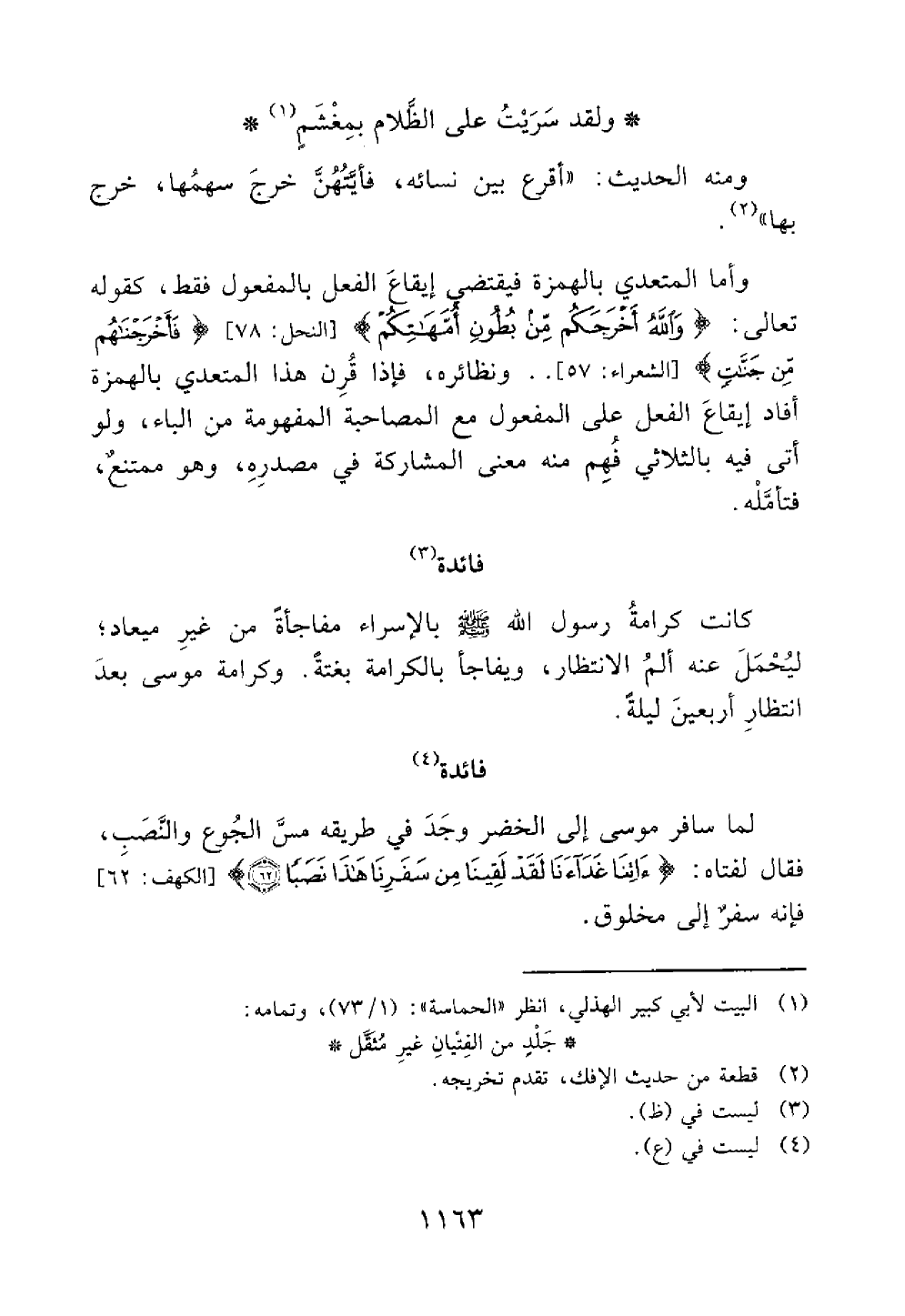 ولقد سريت على الظلام بمعشر ومنه الحديث أقرع بين نسائه فأيتهن خرج سهمها خرج بها // رواه البخاري وابو داود // وأما المتعدي بالهمزة فيقتضي إيقاع الفعل بالمفعول فقط كقوله تعالى والله أخرجكم من بطون أمهاتكم