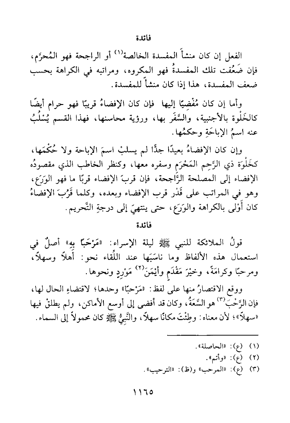 الفعل إن كان منشأالمفسدة الخالصة أو الراجحة فهو المحرم فإن ضعفت تلك المفسدة فهو المكروه ومراتبه في الكراهة بحسب ضعف المفسدة هذا إذا كان منشأ للمفسدة وأما إن كان مفضيا إليها فإن كان الإفضاء قريبا فهو حرام أيضا كالخلوة بالأجنبية والسفر بها ورؤية محاسنها فهذا القسم يسلب عنه اسم الإباحة وحكمها