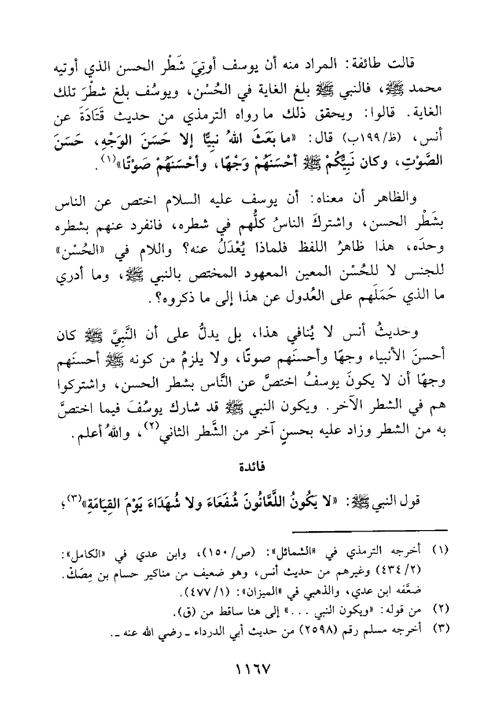 اختص عن الناس بشطر الحسن واشتركوا هم في الشطر الآخر ويكون النبي شارك يوسف فيما اختص به من الشطر وزاد عليه بحسن آخر من الشطر الثاني والله أعلم فائدة اللعانون قول النبي لايكون اللعانون سفعاء ولا شهداء يوم القيامة @
