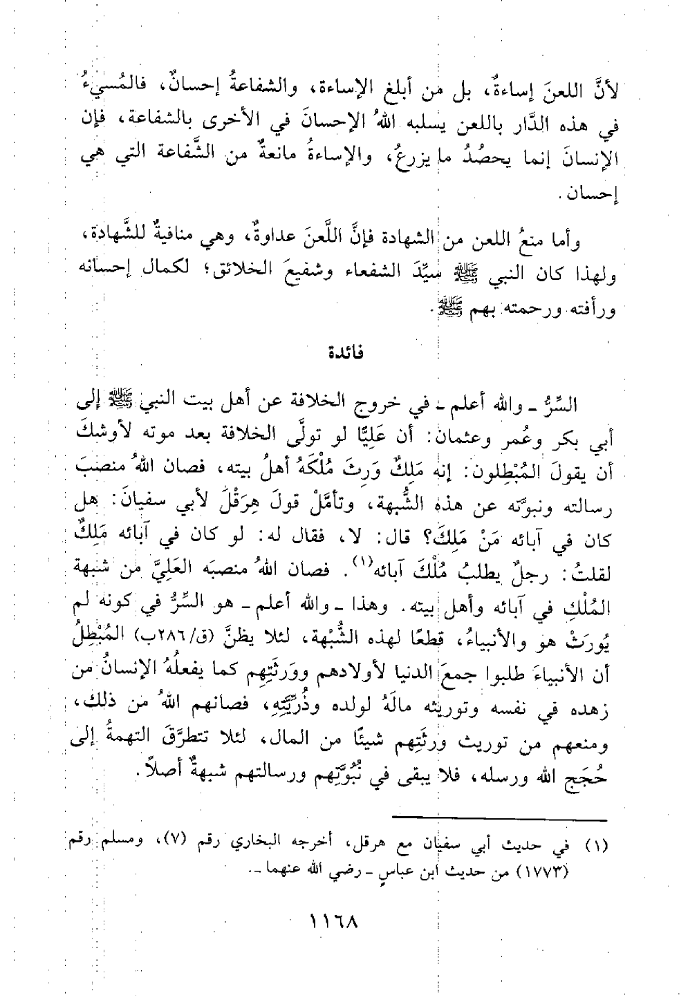 وأما منع اللعن من الشهادة فإن اللعن عداوة وهي منافية للشهادة ولهذا كان النبي الشفعاء وشفيع الخلائق لكمال إحسانه ورأفته ورحمته بهم فائدة السر في خروج الخلافة عن أهل بيت النبي