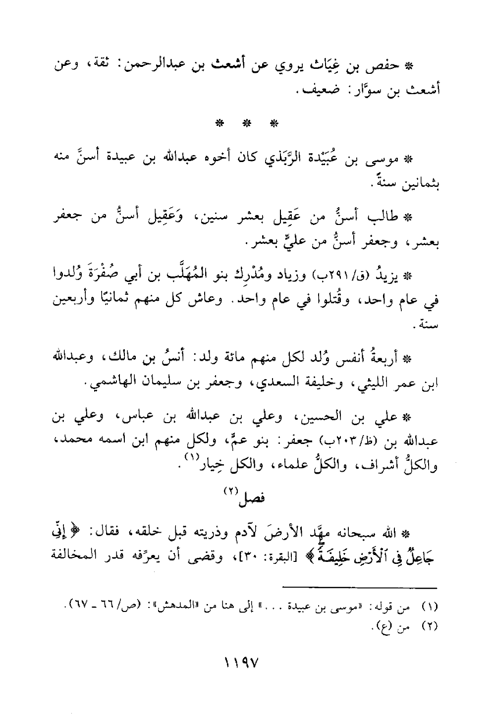 حفص ابن غياث يروى عن أشعث بن عبد الرحمن ثقة وعن اشعث بن سوار ضعيف موسى بن عبيدة الزبدي كان أخوه عبد الله بن عبيدة أسن منه بثمانين سنة طالب أسن من عقيل بعشر سنين وعقيل أسن من جعفر بعشر وجعفر أسن من علي بعشر