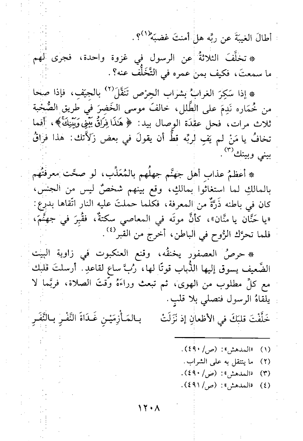 إذا سكر الغراب بشراب الحرص تنقل بالجيف فإذا صحا من خماره ندم على الطلل خالف موسى الخضر في طريق الصحبة ثلاث مرات فحل عقدة الوصال بيد هذا فراق بيني وبينك أفما تخاف يا من لم يف لربه قط أن تقول في بعض زلاتك هذا فراق بيني وبينك