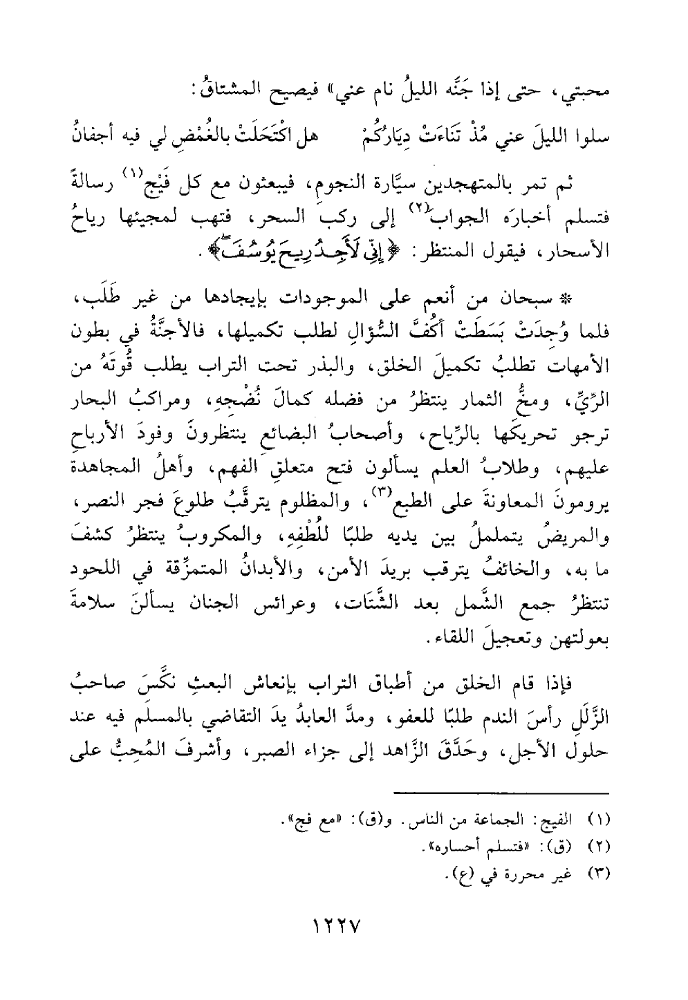 سبحان من أنعم على الموجودات بإيجادها من غير طلب فلما وجدت بسطت اكف السؤال لطلب تكميلها فالأجنة في بطون الأمهات تطلب تكميل الخلق والبذر تحت التراب يطلب قوته من الري ومخ الثمار ينتظر من فضله كمال نضجه ومراكب البحار تحريكها بالرياح وأصحاب البضائع ينتظرون وجود الأرباح عليهم وطلاب العلم يسالون فتح منغلق الفهم وأهل المجاهدة يرومون المعاونة على الطبع والمظلوم يترقب طلوع فجر النصر والمريض يتململ بين يديه طلبا للطفه والمكروب ينتظر كشف ما به والخائف يترقب بريد الأمن والأبدان المتمزقة في اللحود تنتظر جمع الشمل بعد الشتات وعرائس الجنان يسألن سلامة بعولتهن وتعجيل اللقاء فإذا قام الخلق من