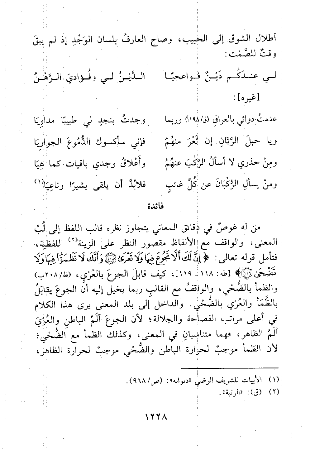 من له غرض في دقائق المعاني يتجاوز نظره قالب اللفظ إلى لب المعنى والواقف مع الألفاظ مقصود على الزينة اللفظية فتأمل قوله تعالى إن لك أن لا تجوع فيها ولا تعرى وأنك لا تظمؤا فيها ولا تضحى كيف قابل الجوع بالعرى والظمأ بالضحى والواقف مع القالب ربما يخيل إليه أن الجوع يقابل بالظمأوالعري بالضحى والداخل إلى بلد المعنى يرى هذا الكلام في اعلى الفصاحة والجلالة لأن الجوع ألم الباطن والعري ألم الظاهر فهما متناسبان في المعني وكذلك الظمأ مع الضحى لأن الظما موجب لحرارة الباطن والضحى موجب لحرارة الظاهر@