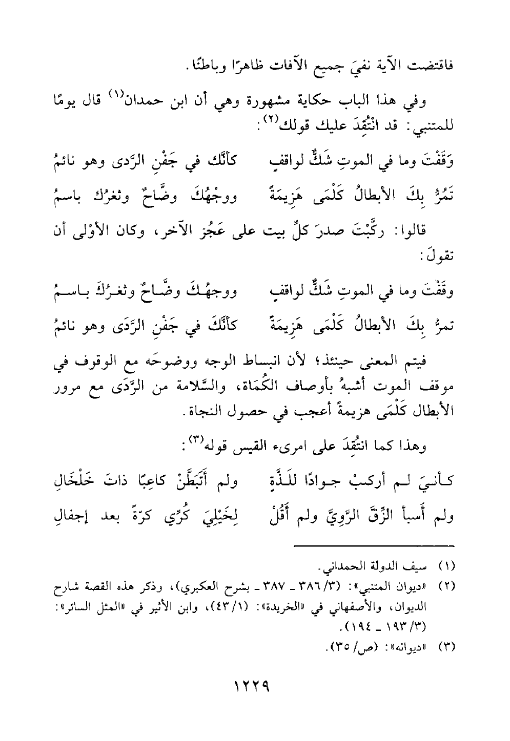 فاقتضت الآية نفي جميع الآفات ظاهرا وباطنا وفي هذا الباب حكاية مشهورة وهي ان ابن حمدان قال يوما للمتنبي قد انتقد عليك قولك