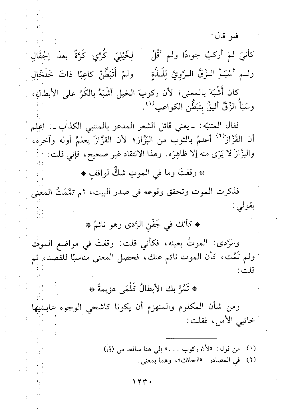 كان أشبه بالمعنى لأن ركوب الخيل اشبه بالكر على الأبطال وسبأ الزق أليق بتبطن الكواعب فقال المتنبة يعني قائل الشعر المدعو بالمتنبي الكذاب أعلم أن القزاز اعلم بالثوب من البزاز لأن القزاز يعلم أوله وآخره والبزاز لا يرى منه إلا ظاهره وهذا الانتقاد غير صحيح فإني قلت وقفت وما في الموت شك لواقف فذكرت الموت وتحقق وقوعه في صدر البيت ثم تممت المعنى بقولي كأنك في جفن الردى وهو نائم والردى الموت بعينه فكأني قلت وقفت في مواضع الموت ولم تمت كأن الموت نائم عنك فحصل المعنى مناسبا للقصد ثم قلت تمر بك الأبطال كلمى هزيمة ومن شأن المكلوم والمنهزم أن يكونا كاشحي الوجوه عابسيها خائبي الأمل فقلت@