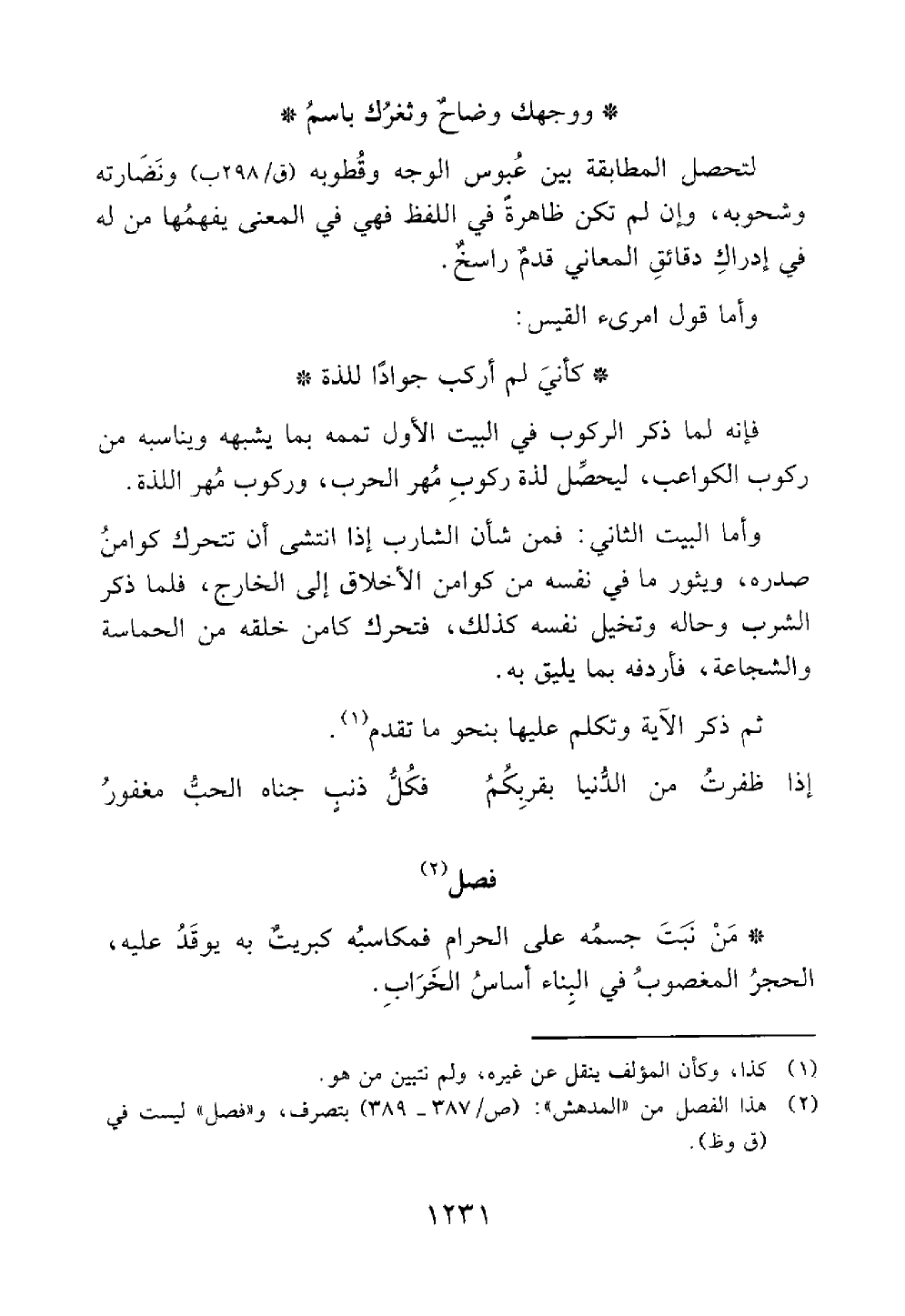 وأما قول امرىء القيس كأني لم اركب جودا للذة فإنه لما ذكر الركوب في البيت الأول تممه بما يشبهه ويناسبه من ركوب الكواعب ليحصل لذة ركوب مهر الحرب وركوب مهر اللذة