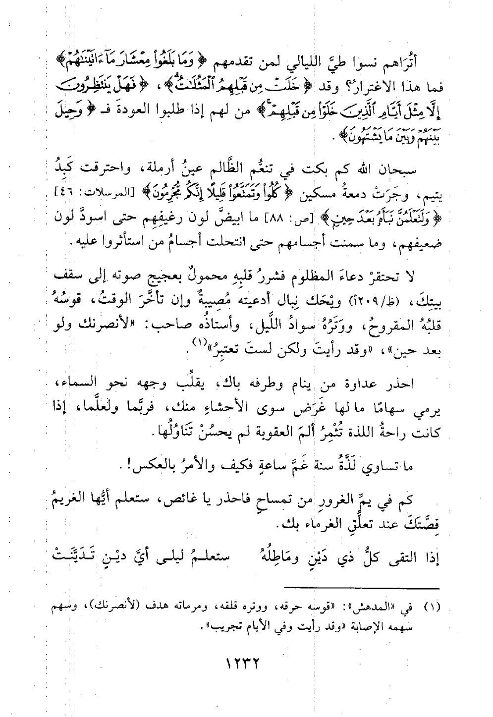 أتراهم نسوا طي الليالي لمن تقدمهم وما بلغوا معشار ما آتيناهم فما هذا الاعترار وقد خلت من قبلهم المثلات فهل ينتظرون إلا مثل أيام الذين خلوا من قبلهم من لهم إذا طلبوا العودة فحيل بينهم وبين ما يشتهون