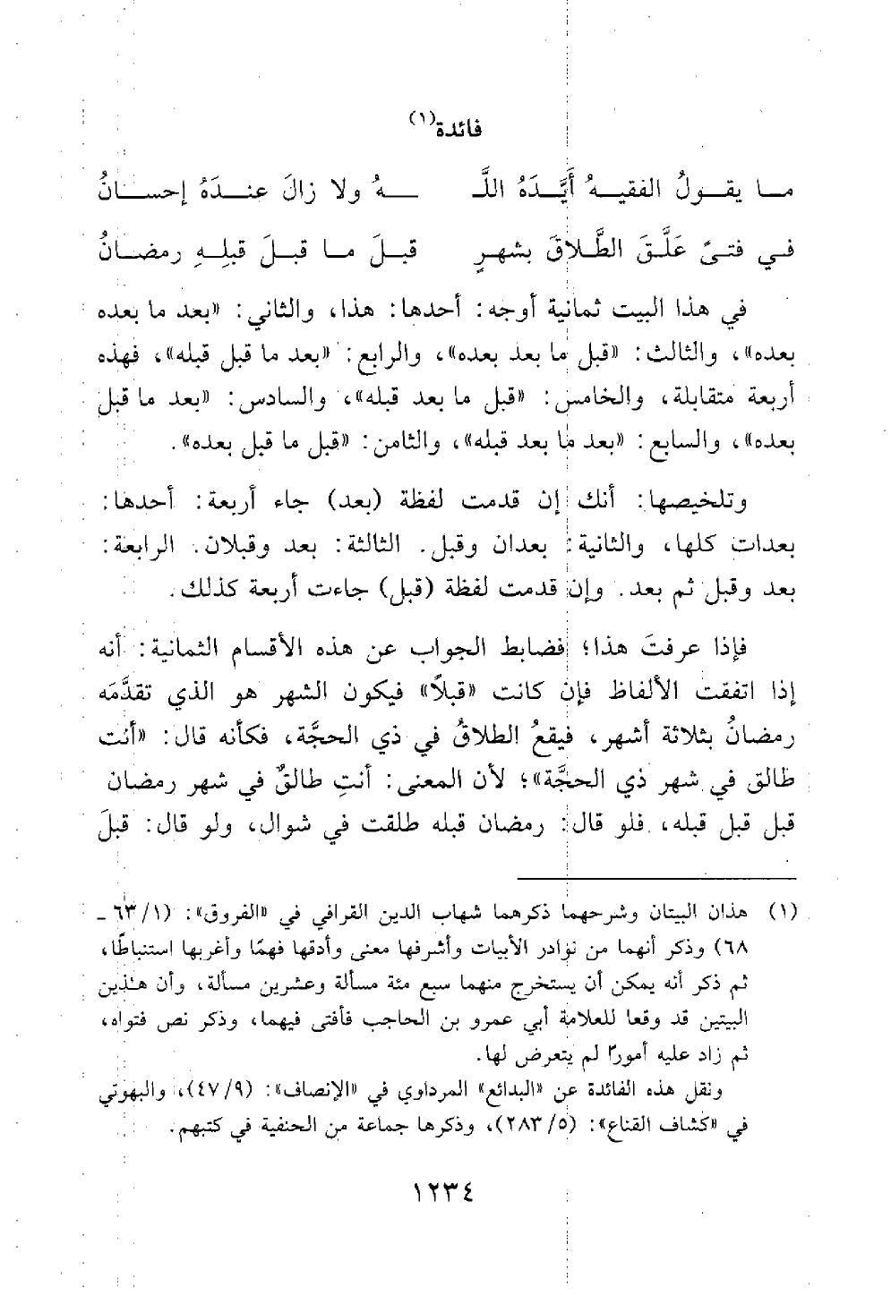 في هذا البيت ثمانية أوجه أحدها هذا والثاني بعدما بعد بعده والثالث قبل ما بعد بعده والرابع بعد ما قبل قبله فهذه أربعة متقابلة والخامس قبل ما بعد قبله والسادس بعد ما قبل بعده والسابع بعد ما بعد قبله والثامن قبل ما قبل بعده