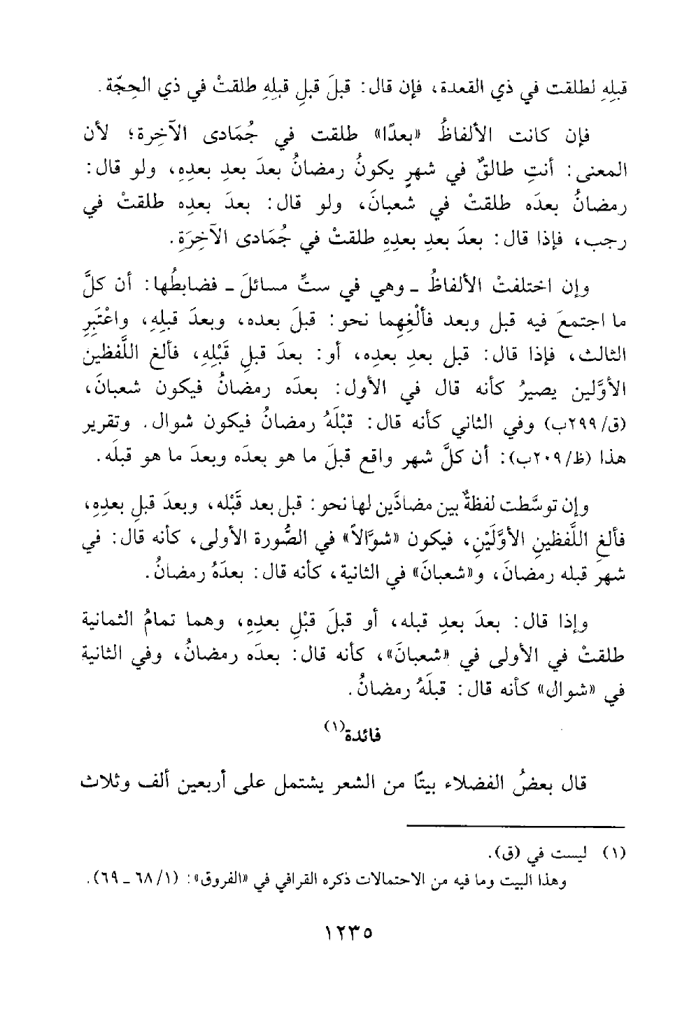 وتقرير هذا أن كل شهر واقع قبل ما هو بعده وبعد ما هو قبله وإن توسطت لفظه بين مضادين لها نحو قبل بعد قلبه وبعد قبل بعده فالغ اللفظين الأولين ويكون شوالا وإذا قال بعد بعد قبله أو قبل قبل بعده وهما تمام الثمانية طلقت في الأولى في شعبان كأنه قال بعده رمضان في الصورة الأولى كأنه قال في شهر رمضان وشعبان في الثانية كأنه قال بعده رمضان وفي الثانية في شوال كأنه قال قبله رمضان فائدة الاحتمالات في بيت من الشعر
