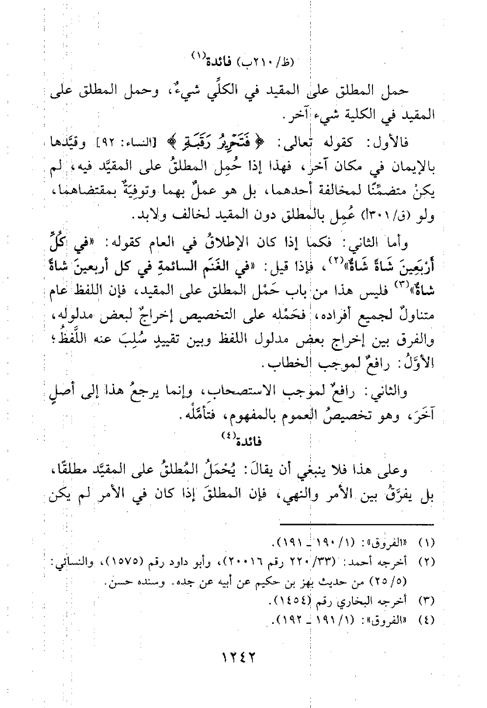 والثاني رافع لموجب الاستصحاب وإنما يرجع هذا إلى أصل آخر وهو تخصيص العموم بالمفهوم فتأمله فائدة وعلى هذا فلا ينبغي أن يقال يحمل المطلق على المقيد مطلقا بل يفرق بين الأمر والنهى فإن المطلق إذا كان في الأمر لم يكن @
