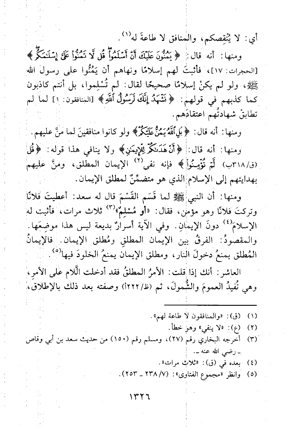 ومنها أن النبي لما اقسم القسم قال له سعد أعطيت فلانا وتركت فلانا وهو مؤمن فقال أو مسلم ثلاث مرات // رواه البخاري ومسلم وأبو داود والنسائي // وأثبت له الإسلام دون الإيمان وفي الآية أسرار بديعة ليس هذا موضعها والمقصود الفرق بين الإيمان المطلق ومطلق الإيمان فالإيمان المطلق يمنع دخول النار ومطلق الإيمان يمنع الخلود فيها