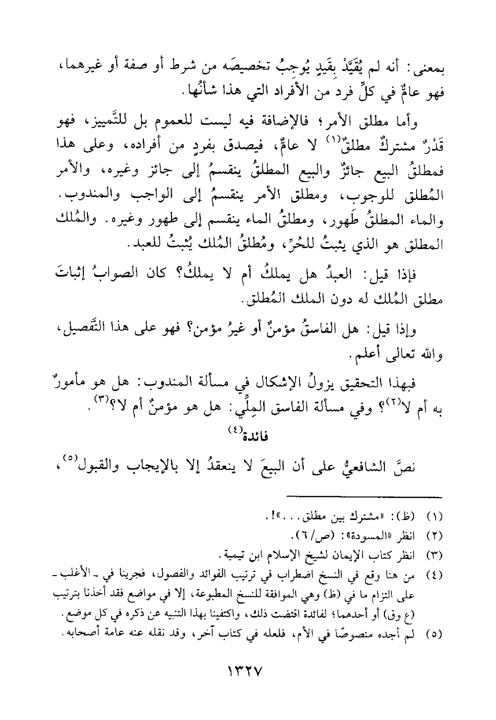 وأما مطلق الأمر فالإضافة فيه ليست للعموم بل للتمييز فهو قدر مشترك مطلق لا عام فيصدق بفرد من افراده وعلى هذا فمطلق البيع جائز والبيع المطلق ينقسم إلى جائز وغيره والأمر المطلق للوجوب ومطلق الأمر ينقسم إلى الواجب والمندوب والماء المطلق طهور ومطلق الماء ينقسم إلى طهور وغيره والملك المطلق هو الذى يثبت للحر ومطلق الملك يثبت للعبد