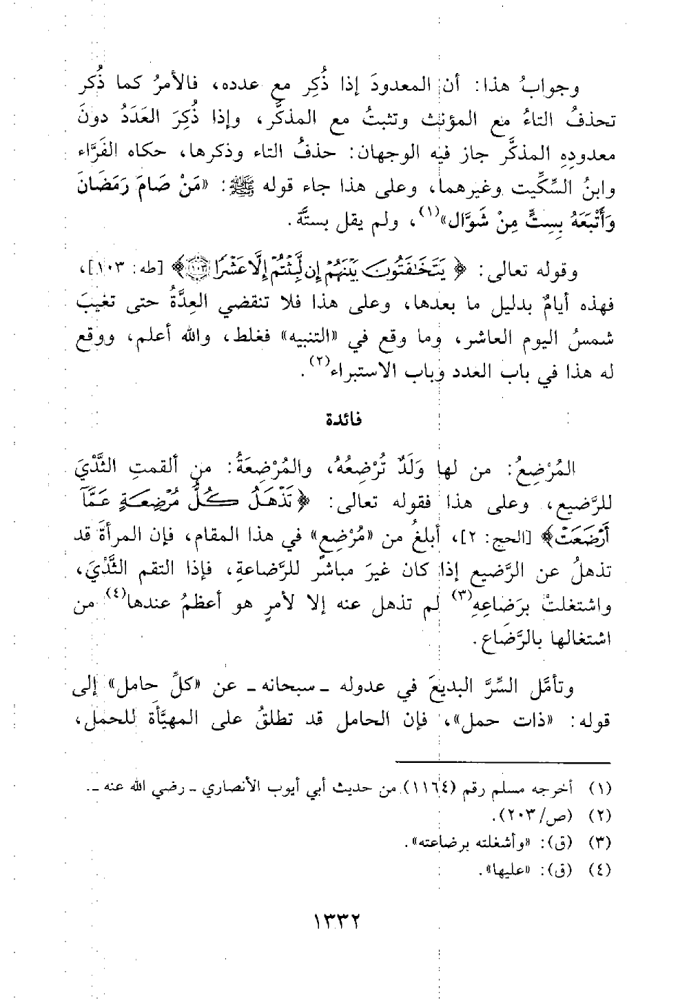 وقوله تعالى يتخافتون بينهم إن لبثتم إلا عشرا فهذه أيام بدليل ما بعدها وعلى هذا فلا نتقضي العدة حتى تغيب شمس اليوم العاشر وما وقع في التنبيه فغلط والله تعالى أعلم ووقع له هذا في باب العدد وباب الاستبراء فائدة الرضع والمرضعة