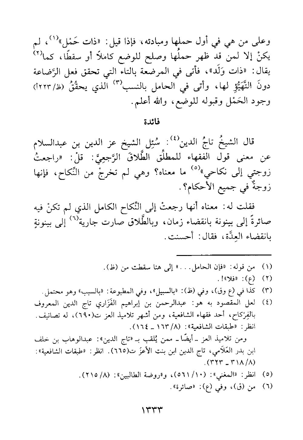 وعلى من هي في أول حملها ومبادئه فإذا قيل ذات حمل لم يكن إلا لمن ظهر حملها وصلح للوضع كاملا أو سقطا كما يقال ذات ولد فأتي في المرضعة بالتاء التي تحقق فعل الرضاعة دون التهيؤ لها وأتى في الحامل بالسبب الذي يحقق وجود الحمل وقبوله للوضع والله تعالى أعلم فائدة قول المطلق الرجعي راجعت زوجتى