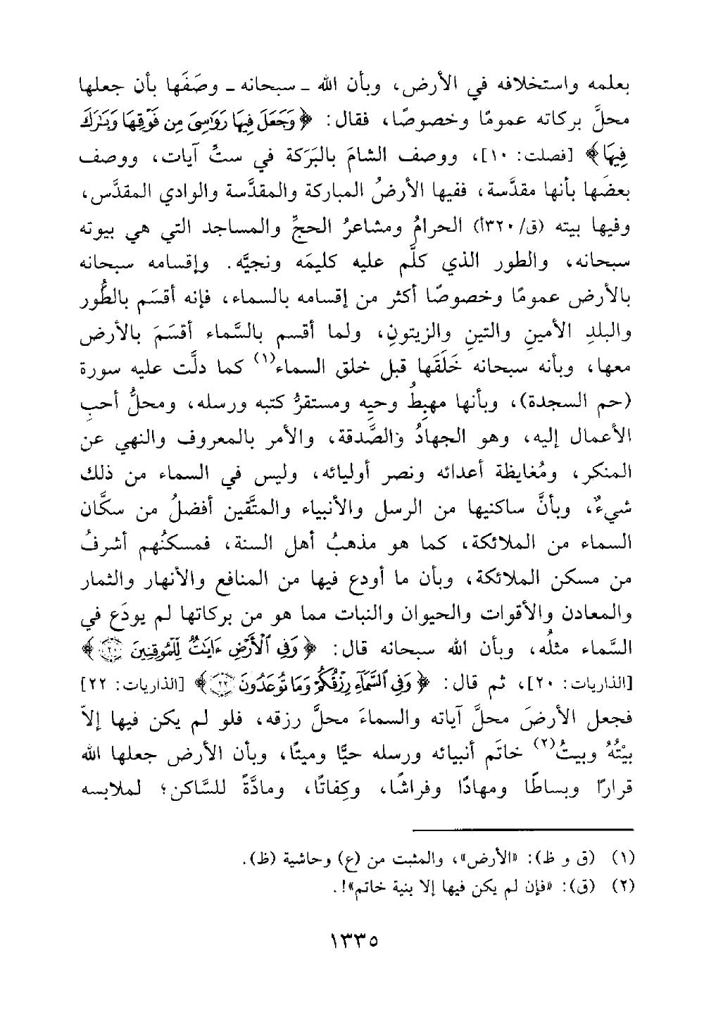 الشام بالبركة في ست آيات ووصف بعضها بأنها مقدسة ففيها الأرض المباركة والمقدسة والوادي المقدس وفيها بيته الحرام ومشاعر الحج والمساجد التي هي بيوته سبحانه والطور الذي كلم عليه كليمة ونجيه وبإقسامه سبحانه بالأرض عموما وخصوصا اكثر من إقسامه بالسماء فإنه أقسم بالطور والبلد الأمين والتين والزيتون ولما اقسم بالسماء أقسم بالأرض معها وبأنه سبحانه خلقها قبل خلق السماء كما دلت عليه سورة حم السجدة وبأنها مهبط وحيه ومستقر كتبه ورسله ومحل احب الأعمال إليه وهو الجهاد والصدقة والأمر بالمعروف والنهي عن المنكر ومغايظة أعدائه ونصر اوليائه وليس في السماء من ذلك شيء وبأن ساكنيها من الرسل والأنبياء والمتقين افضل من سكان السماء من الملائكة كما هو مذهب أهل السنة فمسكنهم أشرف من مسكن الملائكة وبأن ما اودع فيها من المنافع والأنهار والثمار والمعارف والأقوات والحيوان والنبات ما هو من بركاتهم لم يودع في السماء مثله وبأن الله سبحانه قال وفي الأرض آيات للمؤمنين ثم قال وفي السماء رزقكم وما توعدون فجعل الأرض محل آياته والسماء محل رزقه ولو لم يكن له فيها إلا بيته وبيت خاتم انبيائه ورسله حيا وميتا وبأن الارض جعلها الله قرارا وبساطا ومهادا وفراشا وكفاتا ومادة للساكن لملابسه@
