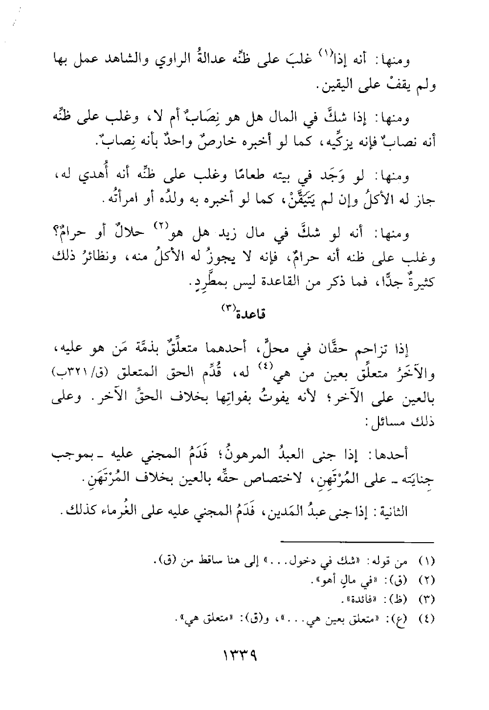 ومنها أنه لو شك في مال زيد هل هو حلال أم حرام وغلب على ظنه أنه حرام فإنه لا يجوز له الأكل منه ونظائر ذلك كثيرة جدا فما ذكر من القاعدة ليس بمطرد فائدة تزاحم الحقين