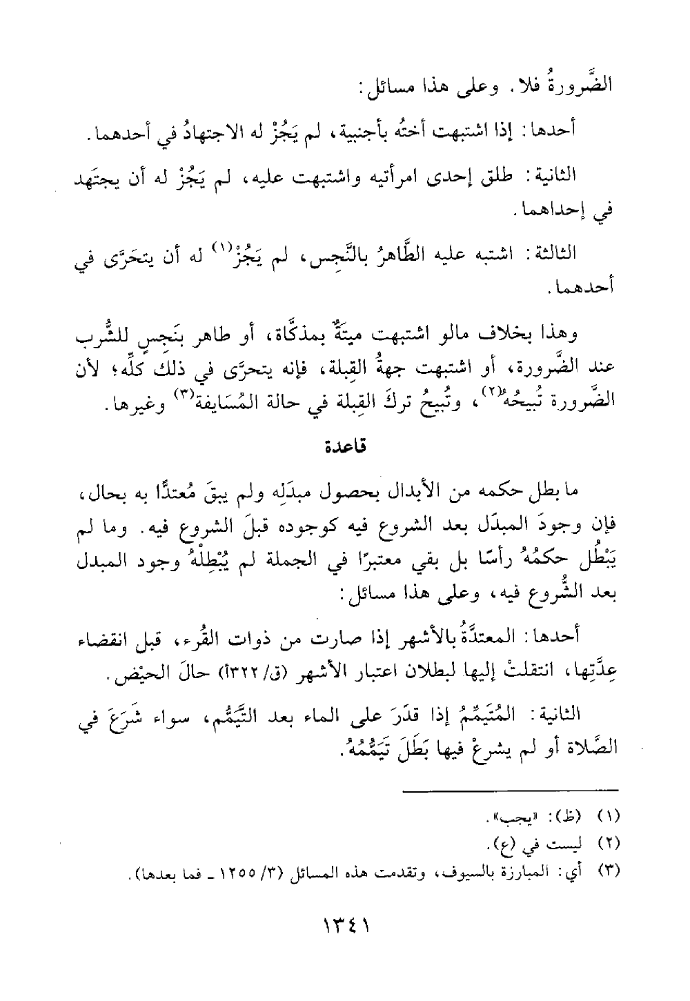 الثالثة اشتبه عليه الطاهر بالنجس لم يجب عليهم أن يتحرى في أحدهما وهذا بخلاف ما لو اشتبهت ميته بمذكاة أوطاهر بنجس للشرب عند الضرورة تبيحه وتبيح ترك القبلة في حال المسايفة وغيرها قاعد مسائل في الإبدال