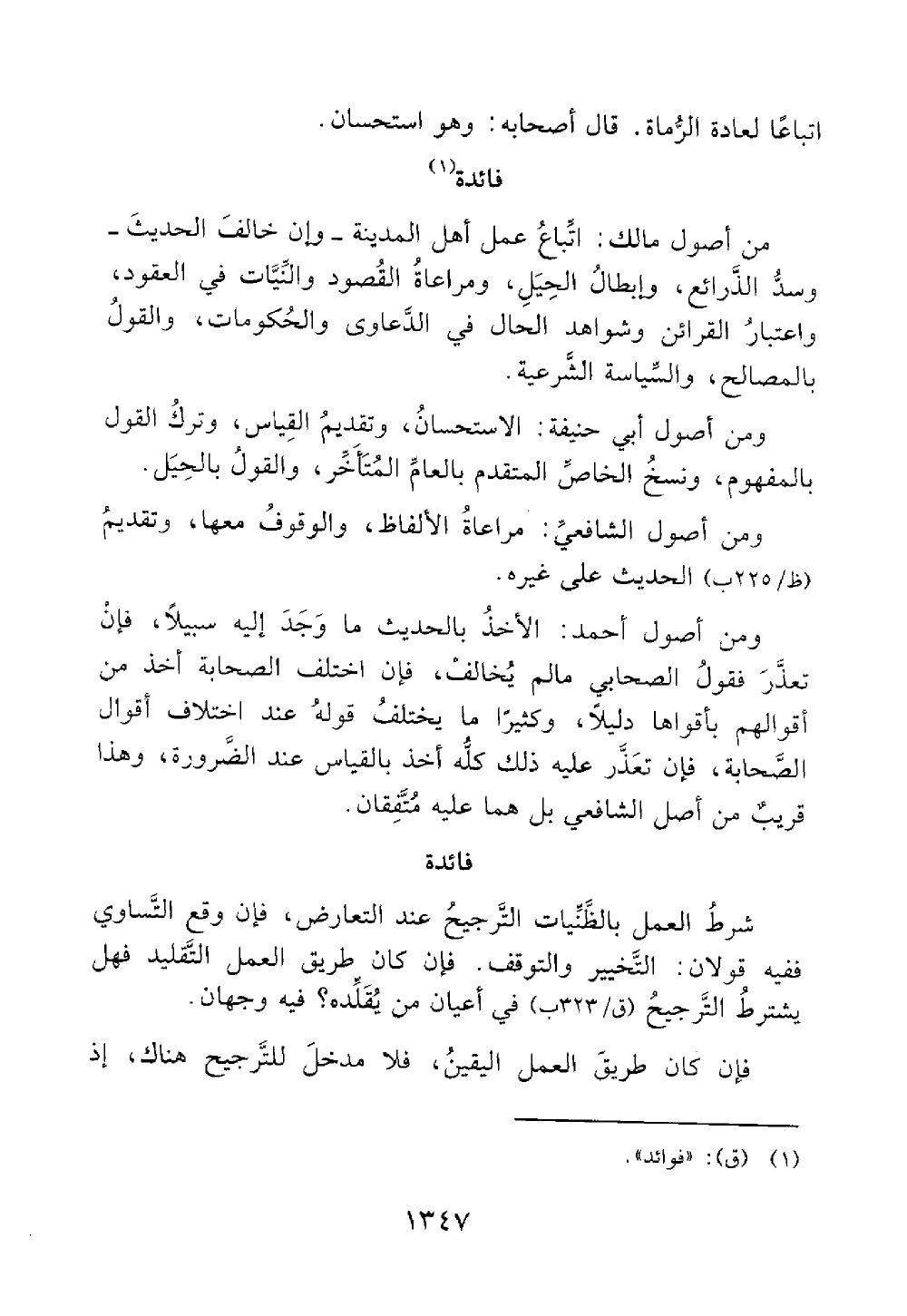 ومن أصول الشافعي مراعاة الألفاظ والوقوف معها وتقديم الحديث على غيره ومن أصول أحمد الأخذ بالحديث ما وجد إليه سبيلا فإن تعذر فقول الصحابي ما لم يخالف فإن اختلف أخذ من أقوالهم بأقواها دليلا وكثيرا ما يختلف قوله عند اختلاف أقوال الصحابة فإن تعذر عليه ذلك كله أخذ بالقياس عند الضرورة وهذا قريب من أصول الشافعي بل هما عليه متفقان فائدة شرط العمل بالظنيات