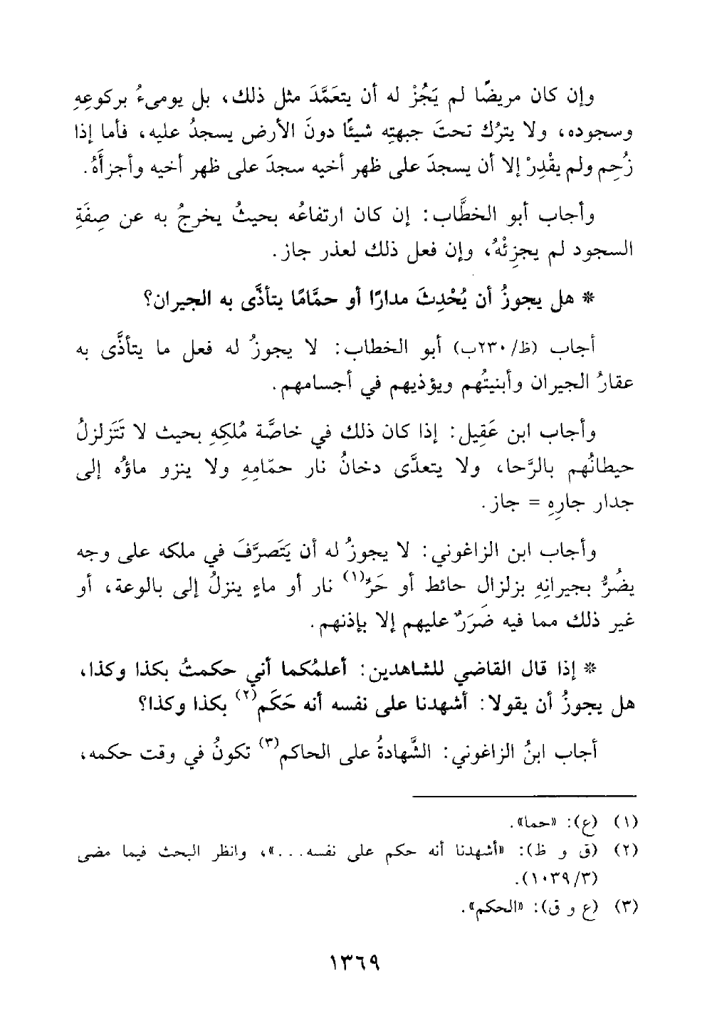 هل يجوز له ان يحدث حماما يتأذى به الجيران أجاب ابو الخطاب لا يجوز له فعل ما يتأذى به عقار الجيران وأبنيتهم ويؤذيهم في إجسامهم