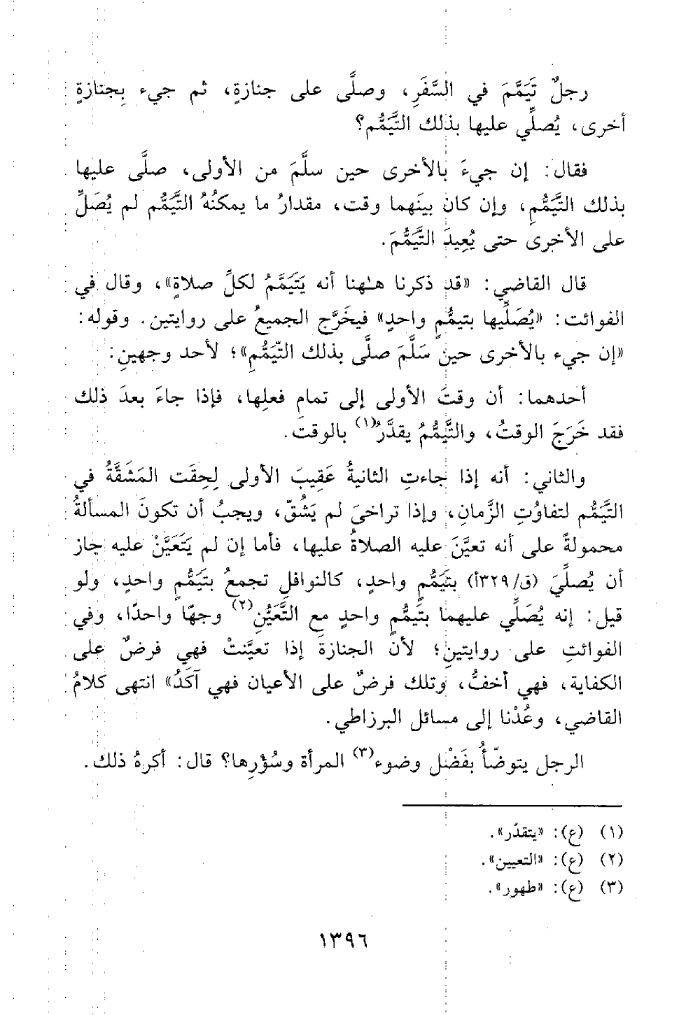 والثاني أنه إذا جاءت الثانية عقيب الأولى لحقته المشقة في التيمم لتفاوت الزمان وإذا تراخى لم يشق ويجب أن تكون المسألة محمولة على أنه تعين عليه الصلاة عليها فأما إن لم يتعين عليه جاز أن يصلي بتيمم واحد كالنوافل تجمع بتيمم واحد ولو قيل إنه يصلى عليها بتيمم واحد مع التعين وجها واحدا وفي الفوائت على روايتين لأن الجنازة إذا تعينت فهي فرض على الكفاية فهي اخف وتلك فرض على الأعيان فهي آكد انتهى كلام القاضي وعدنا إلى مسائل البرزاطي