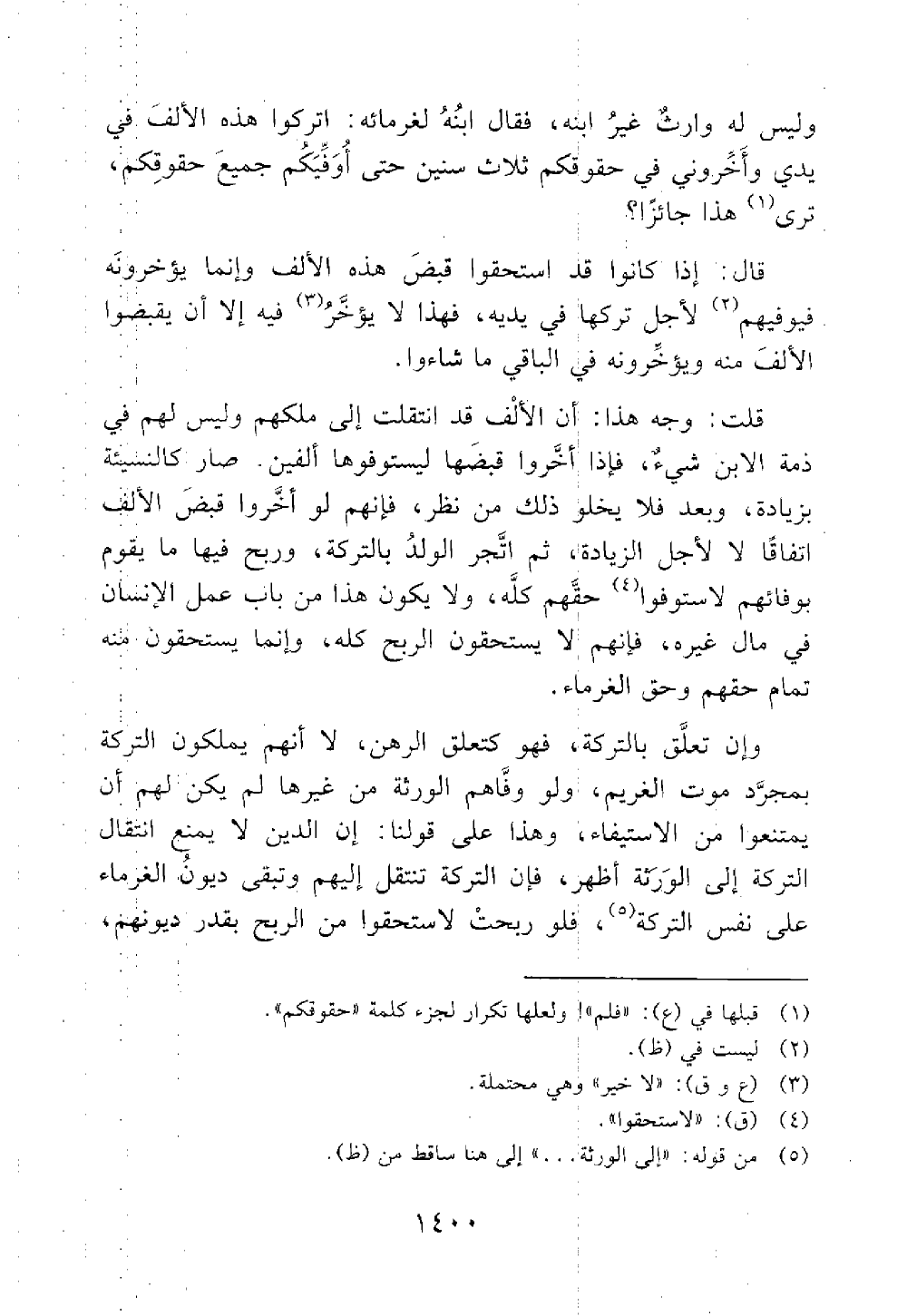 قلت وجه هذا الألف قد انتقلت إلى ملكهم وليس له في ذمة الإبن شيء فإذا أخروا قبضها استوفوها ألفين صار كالنسيئة بزيادة وبعد فلا يخلوا ذلك من نظر فإنهم لو اخروا فبض الألف اتفاقا لا لأجل الزيادة ثم أتجر الولد بالتركة وربح فيها ما يقوم بوفائهم لا ستوفوا حقهم كله ولا يكون هذا من باب عمل الإنسان في مال غيره فإنهم لا يستحقون الربح كله وإنما يستحقون منه تمام حقهم وحق الغرماء