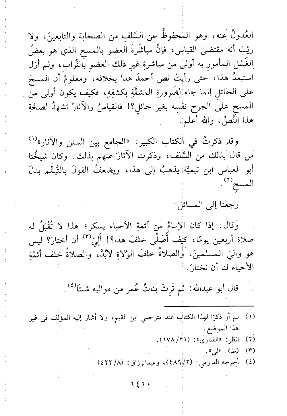 وقد ذكرت في الكتاب الكبير الجامع بين السنن والآثار من قال بذلك من السلف وذكرت الآثار عنهم بذلك وكان شيخنا ابو العباس بن تيمية رحمة الله يذهب إلى هذا ويضعف القول بالتيمم بدل المسح