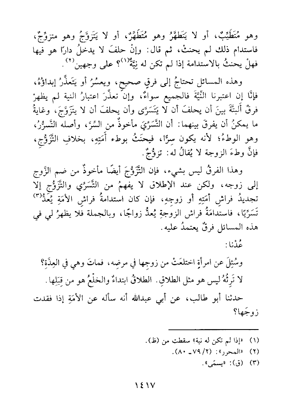 وهذه المسألة تحتاج إلى فرق صحيح ويعسر أو يتعذر إبداؤه فأما إن اعتبرنا النية فالجميع سواء وإن تعذر اعتبار النية لم يظهر فرق البتة بين أن يحلف أن لا يتسرى أو أن يحلف أن لا يتزوج فيحنث بوطء أمته بخلاف التزوج فإن وطء الزوجة لا يقال له تزوج وهذا الفرق ليس بشيء فإن التزوج أيضا مأخوذ من ضم الزوج إلى زوجة ولكن عند الاطلاق لا يفهم من التسرى والتزوج إلا تجديد فراش أمته أو زوجه فإن كان استدامة فراش الأمة يعد تسريا فاستدامه فراش الزوجة يعد زواجا وبالجملة فلا يظهر لي في هذه المسائل فرق يعتمد عليه