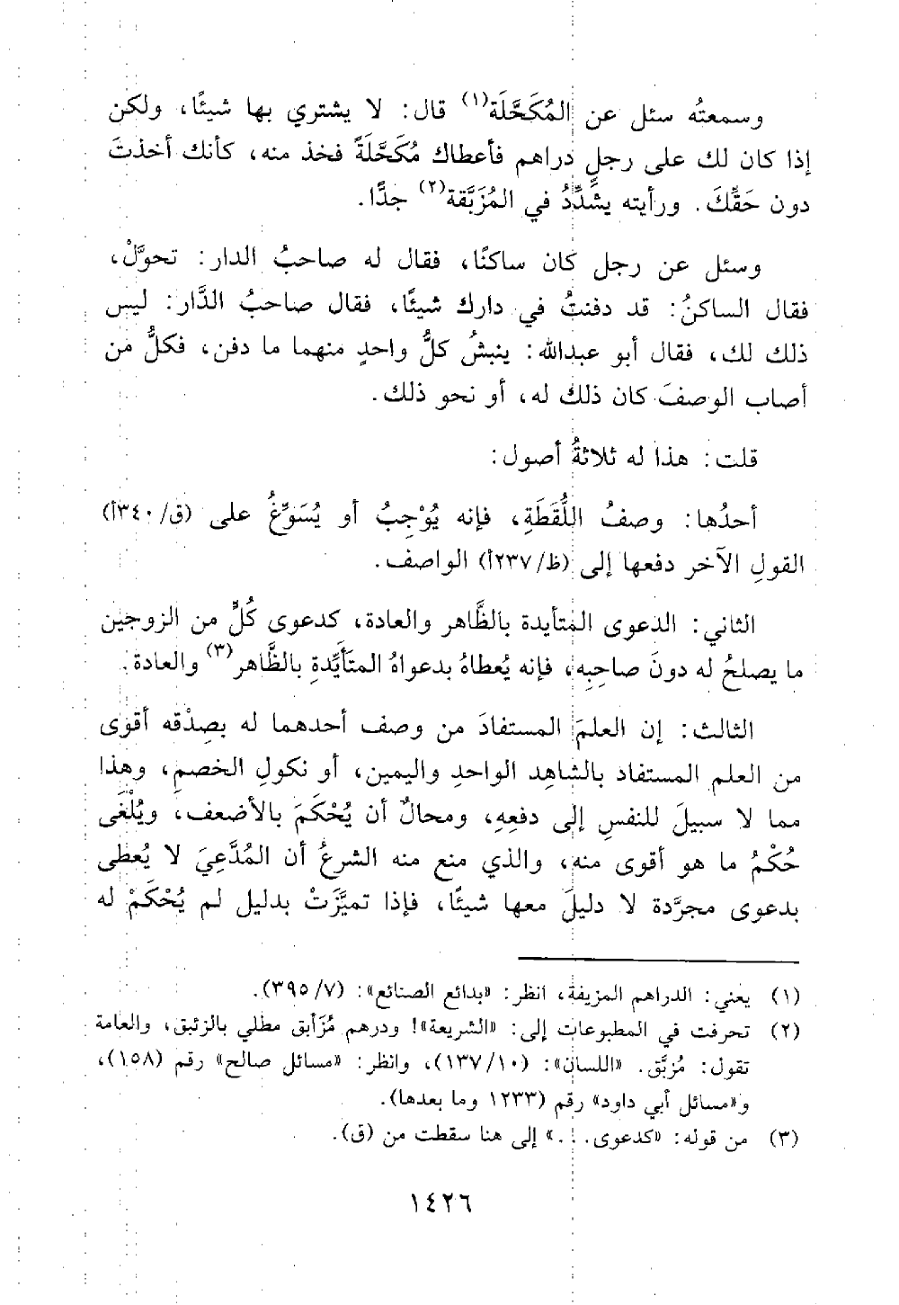 قلت هذا له ثلاثة اصول احدها وصف اللقطة فإنه يوجب او يسوغ على القول الآخر دفعها إلى الواصف الثانى الدعوى المؤيدة بالظاهر والعادة الثالث إن العلم المستفاد من وصف أحدهما له بصدقة أقوى من العلم المستفاد بالشاهد الواحد واليمين أو نكول الخصم وهذا ما لا سبيل للنفس إلى دفعه ومحال أن يحكم بالأضعف ويلغى حكم ما هو أقوى منه والذى منع منه الشرع أن المدعى لا يعطي بدعوى مجردة لا دليل معها شيئا فإذا تميزت بدليل لم يحكم له @