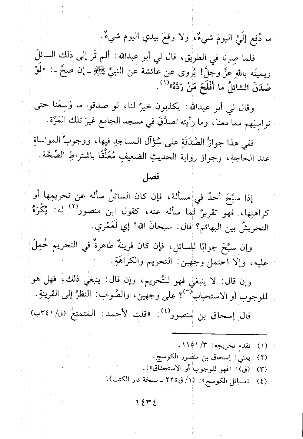 وقال لي أبو عبدالله يكذبون خير لنا لو صدقوا ما وسعنا حتى نواسيهم بما معنا وما رأيته تصدق في مسجد الجامع غير تلك المرة ففي هذا جواز الصدقة على سؤال المساجد فيها ووجوب المواساة عند الحاجة وجواز رواية الحديث الضعيف فقلنا باشتراط الصحة