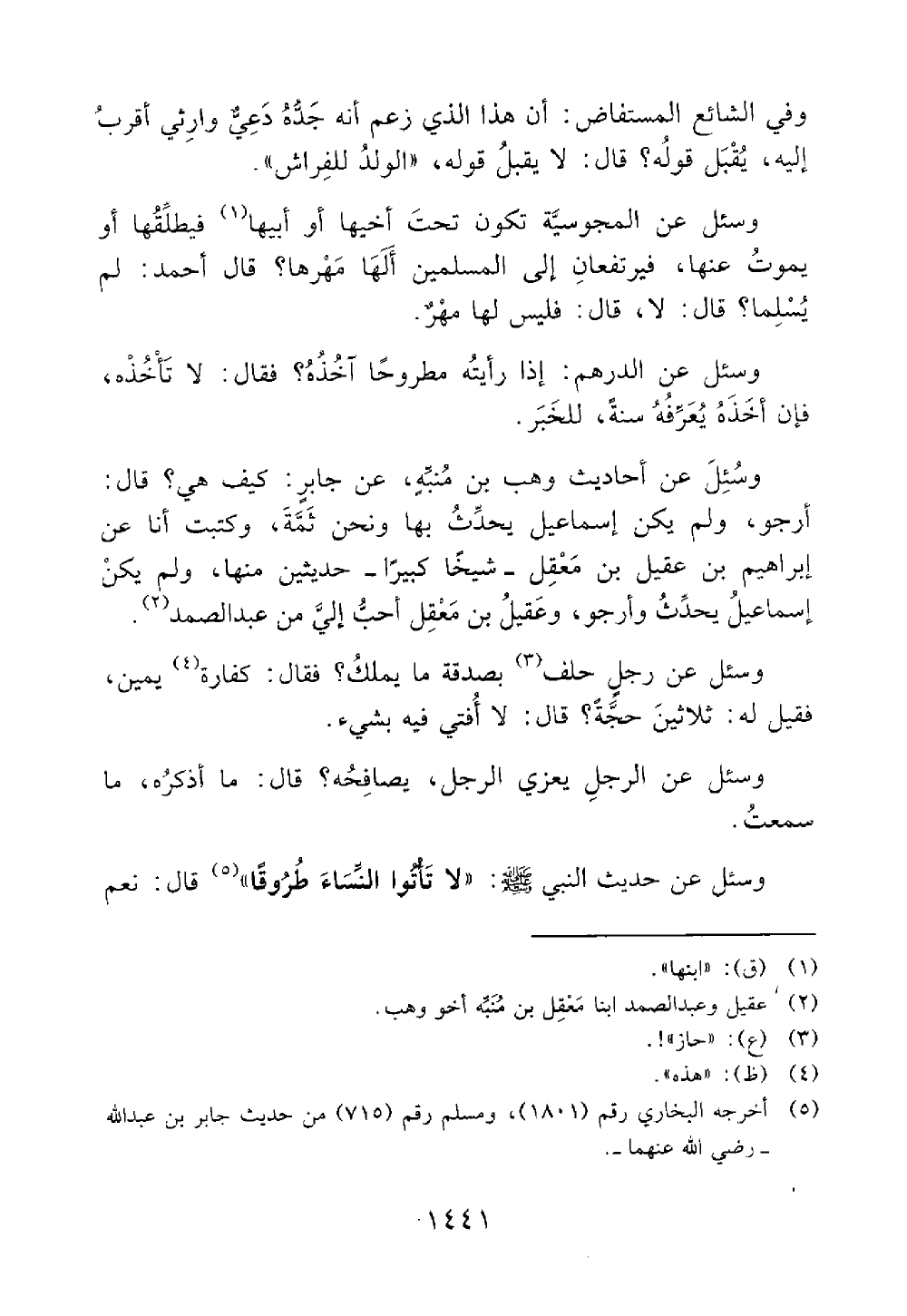 وسئل عن الدرهم إذا رأيته مطروحا هل آخذه قال لا تأخذه فإن أخذه يعرفه سنة للخبر وسئل عن أحاديث وهب بن منبه عن جابر كيف هي قال أرجو ولم يكن إسماعيل يحدث بها ونحن ثمة وكتبت أنا عن إبراهيم بن عقيل بن معقل شيخا كبيرا حديثين منها ولم يكن إسماعيل يحدث وأرجوا وعقيل بن معقل احب إلي من عبد الصمد