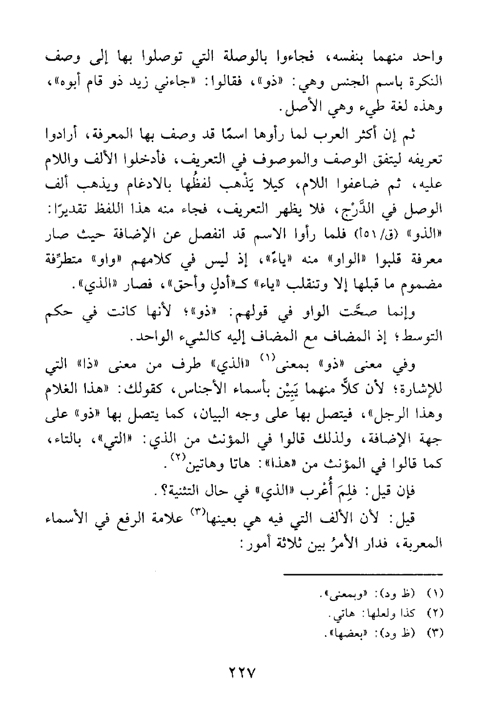 ثم إن أكثر العرب لما رآها اسما قد وصف بها المعرفة أرادوا تعريفه ليتفق الوصف والموصوف في التعريف فأدخلوا الألف واللام عليه ثم ضاعفوا اللام كيلا يذهب لفظها بالإدغام وتذهب ألف الوصل في الدرج فلا يظهر التعريف فجاء منه هذا اللفظ تقديرا ل ذو فلما رأوا الإسم قد انفصل عن الإضافة حيث صار معرفة قلبوا الواو منه ياء إذ ليس في كلامهم واو متطرفة مضموم ما قبلها إلا وتنقلب ياء كأدل وأحق وإنما صحب الواو في قولهم ذو لأنها كانت في حكم التوسط إذ المضاف مع المضاف إليه كالشيء الواحد في معنى ذو وبمعنى الذي طرف من معنى ذا التي للإشارة لأن كلا منهما يبين بأسماء الأجناس كقولك هذا الغلام وهذا الرجل فيتصل بها على وجه البيان كما يتصل بها ذو على جهة الإضافة وكذلك قالوا في المؤنث من الذي التي بالتاء كما قالوا في المؤنث من هذا هاتان وهاتين إعراب الذي في حالة التثنية