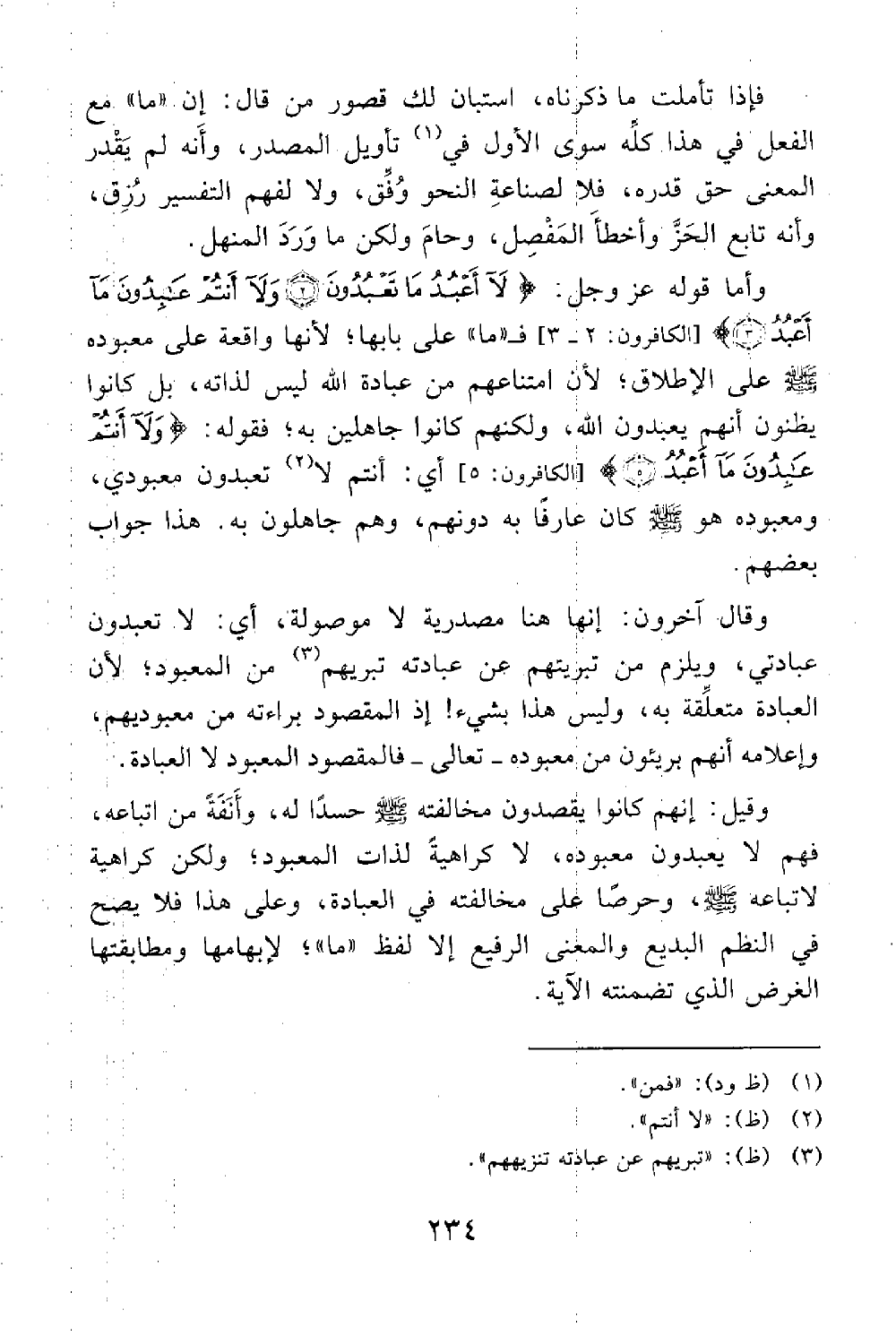 قال آخرون إنها هنا مصدرية لا موصولة أي لا تعبدون عبادتي ويلزم من تنزيههم عن عبادته تنزيههم عن المعبود لأن العبادة متعلقة به وليس هذا بشيء إذ المقصود براءته من معبوديهم وإعلامه أنهم بريئون من معبوده تعالى فالمقصود المعبود لا العبادة