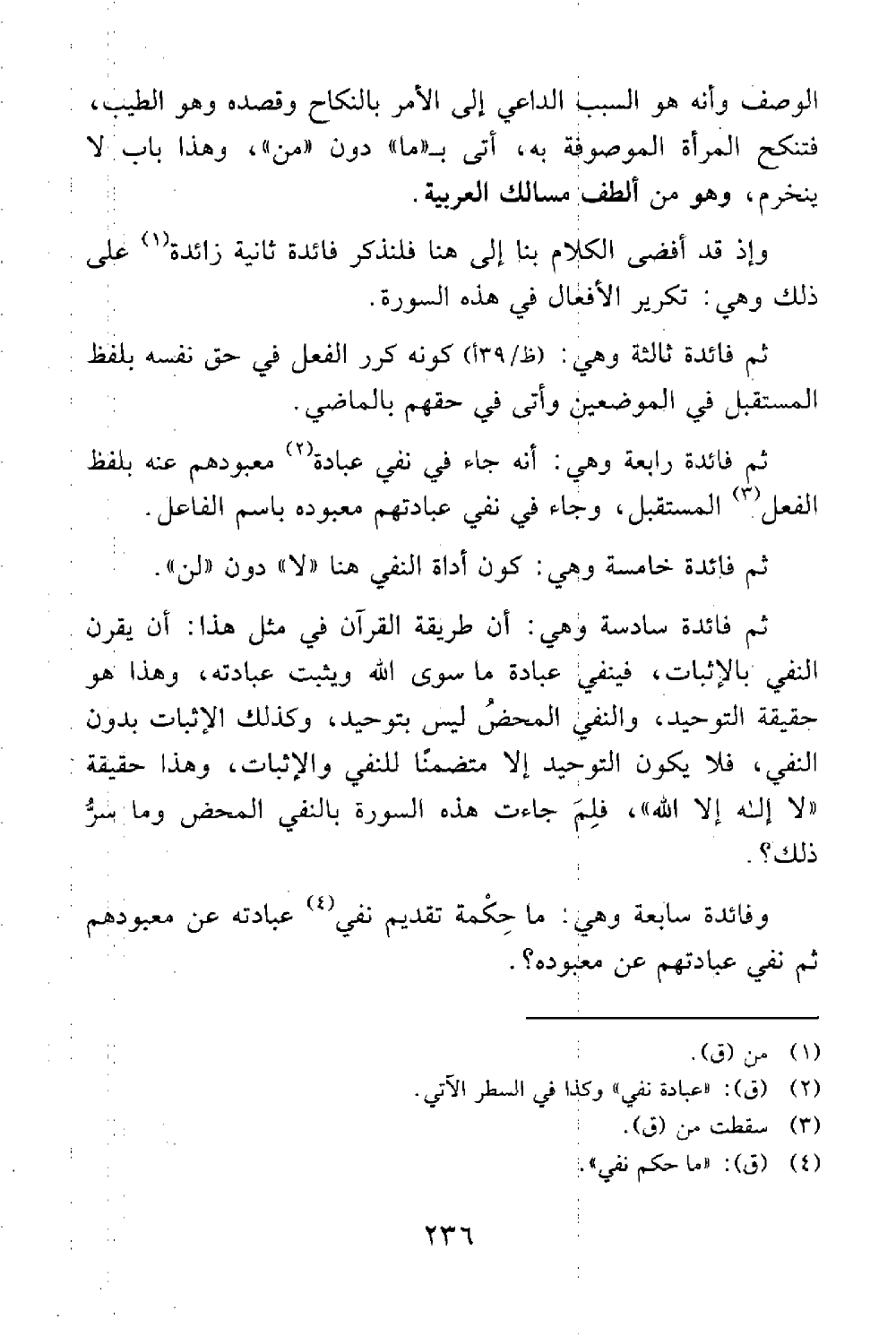 ثم فائدة رابعة وهي أنه جاء في نفي عبادة معبودهم عنه بلفظ الفعل المستقبل وجاء في نفي عبادتهم معبوده باسم الفاعل