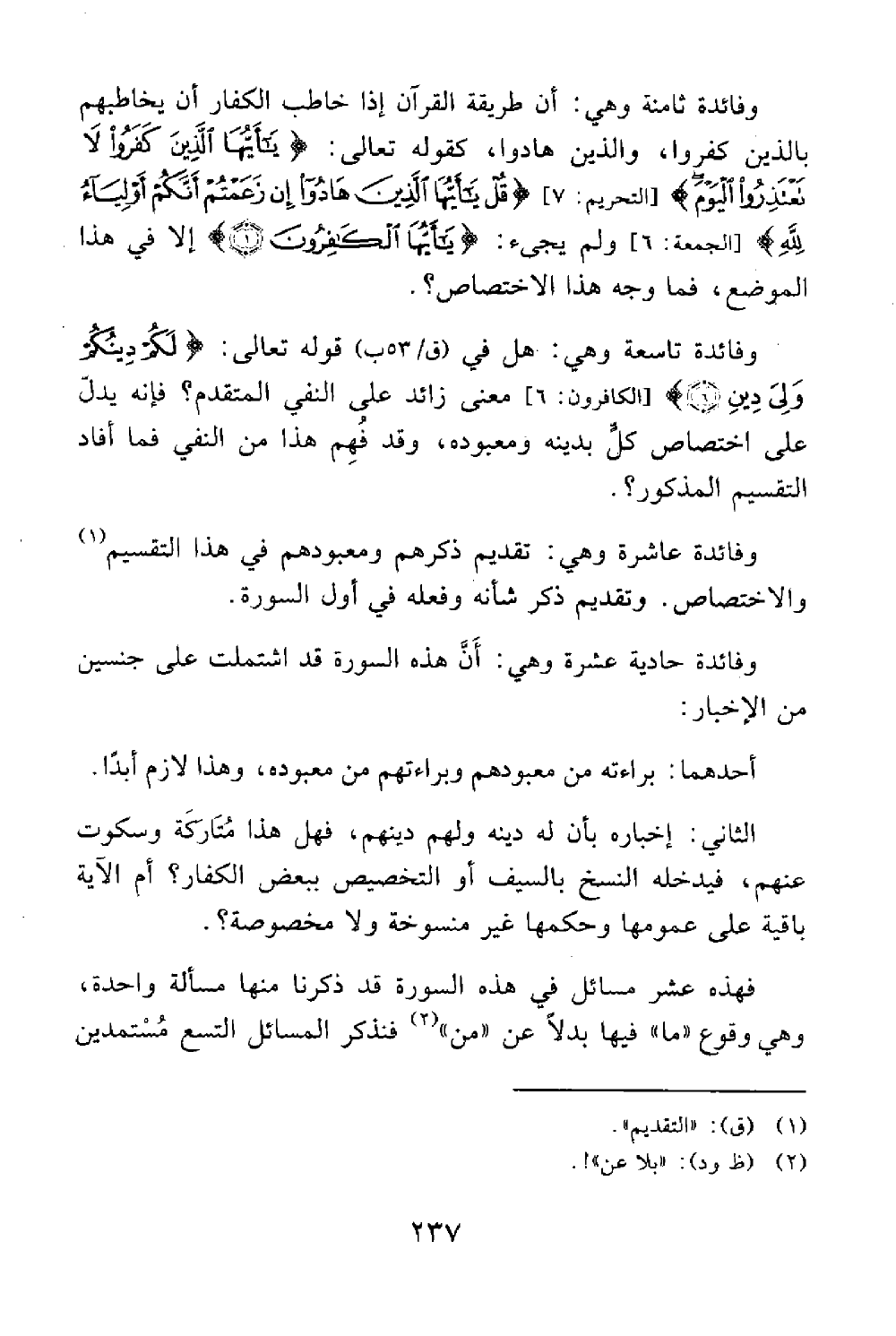 وفائدة تاسعة وهي هل في قوله لكم دينكم ولي دين الكافرون 6 معنى زائد على النفي المتقدم فإنه يدل على اختصاص كل بدينه ومعبوده وقد فهم هذا من النفي فما أفاد التقسيم المذكور