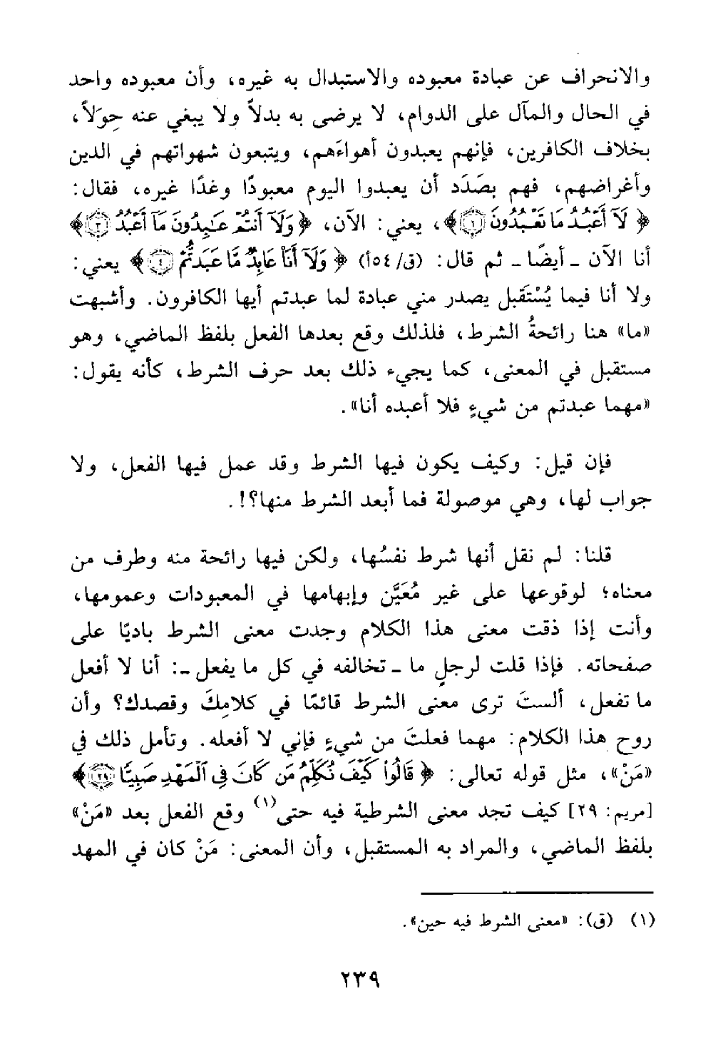 وتأمل ذلك من مثل قوله تعالى قالوا كيف نكلم من كان في المهد صبيا مريم 29 كيف تجد معنى الشرطية فيه حتى وقع الفعل بعد من بلفظ الماضي والمراد به المستقبل وأن المعنى من كان في المهد @