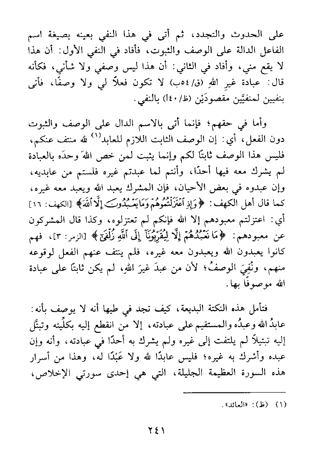 وأما في حقهم فإنما أتى بالإسم الدال على الوصف والثبوت دون الفعل أي أن الوصف الثابت اللازم العائد لله منتف عنكم فليس هذا الوصف ثابتا لكم وإنما ثبت لمن خص الله وحده بالعبادة لم يشرك معه فيها أحدا وأنتم لما عبدتم غيره فلستم من عابديه وإن عبدوه في بعض الأحيان فإن المشرك يعبد الله ويعبد معه غيره كما قال أهل الكهف وإذ اعتزلتموهم وما يعبدون إلا الله الكهف 16 أي اعتزلتم معبودهم إلا الله فإنكم لم تعتزلوه