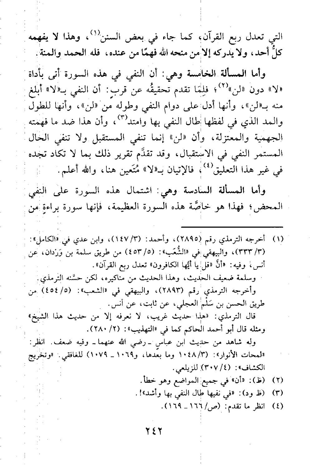 وأما المسألة الخامسة وهي أن النفي في هذه السورة أتى بأداة لا دون لن وذلك لأن النفي ب لا أبلغ منه ب لن وأن لا أدل على دوام النفي وطوله من لن وأنها للطول والمد الذي في نفيها طال النفي بها واشتد وأن هذا ضد ما فهمته الجهمية والمعتزلة من أن لن إنما تنفي المستقبل ولا تنفي الحال المستمر النفي في الإستقبال وقد تقدم تقرير ذلك بما لا تكاد تجده في غير هذا التعليق فالإتيان بلا متعين هنا والله أعلم