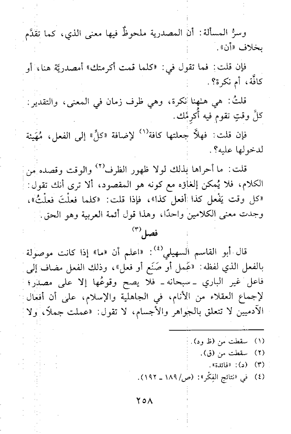 قلت ما أحراها بذلك لولا ظهور الظرف والوقت وقصده من الكلام فلا يمكن إلغاؤه مع كونه هو المقصود ألا ترى أنك تقول كل وقت يفعل كذا أفعل كذا فإذا قلت كلما فعلت فعلت وجدت معنى الكلامين واحدا وهذا قول أئمة العربية وهو الحق الرد على المعتزلة فصل قال أبو القاسم السهيلي اعلم أن ما إذا كانت موصولة بالفعل الذي لفظه عمل أو صنع أو فعل وذلك الفعل مضاف إلى فاعل غير الباري سبحانه فلا يصح وقوعها إلا على مصدر لإجماع العقلاء من الأنام في الجاهلية والإسلام على أن أفعال الآدميين لا تتعلق بالجواهر والأجسام لا تقول عملت جملا ولا @