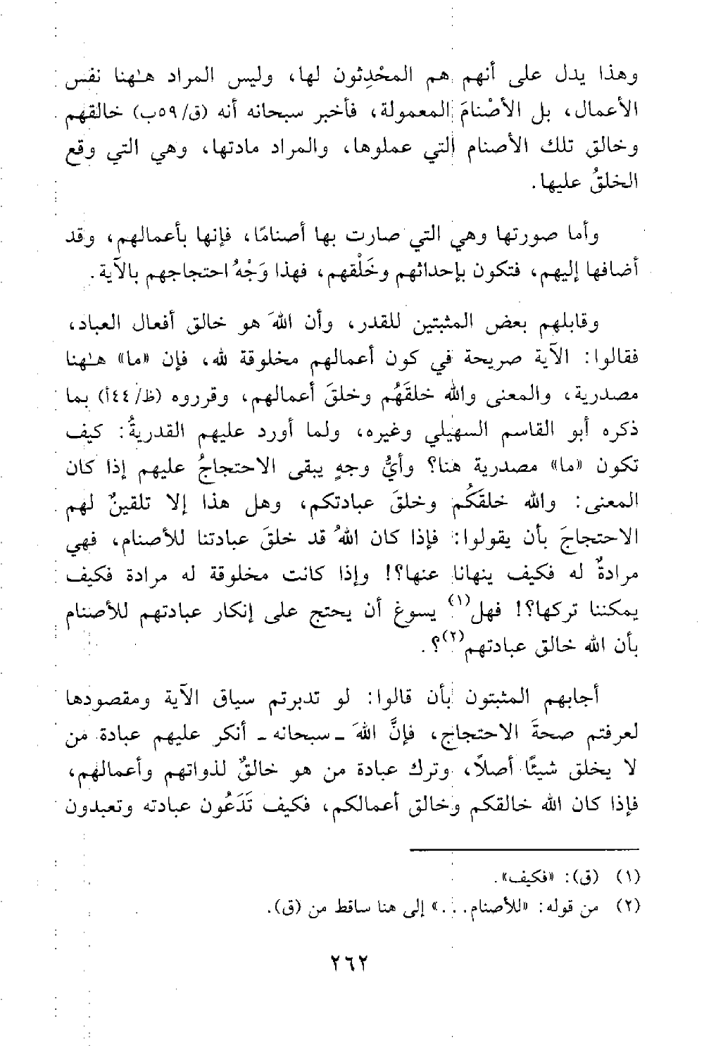 وقابلهم بعض المثبتين للقدر وأن الله هو خالق أفعال العباد فقالوا الآية صريحة في كون أعمالهم مخلوقة لله فإن ما ههنا مصدرية والمعنى والله خلقهم وخلق أعمالهم وقرروه بما ذكره السهيلي وغيره ولما أورد عليهم القدرية كيف تكون ما مصدرية هنا وأي وجه يبقى للإحتجاج عليهم إذا كان المعنى والله خلقكم وخلق عبادتكم وهل هذا إلا تلقين لهم الإحتجاج بأن يقولوا فإذا كان الله قد خلق عبادتنا للأصنام فهي مرادة له فكيف ينهانا عنها وإذا كانت مخلوقة فكيف يمكننا تركها فهل يسوغ أن يحتج على إنكار عبادتهم