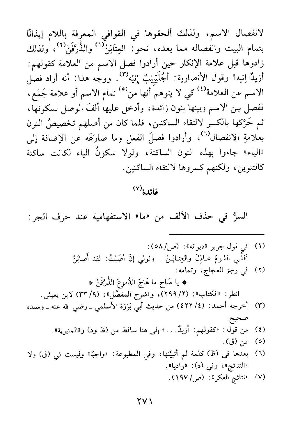 لانفصال الإسم ولذلك ألحقوها في القوافي المعرفة باللام أبدا بإتمام البيت وانفصاله مما بعده نحو العتابا والزرافا ولذلك زادوها قبل علامة الإنكار حين أرادوا فصل الإسم من العلامة كي لا يتوهم أنها تمام الإسم أو علامة جمع ففصل