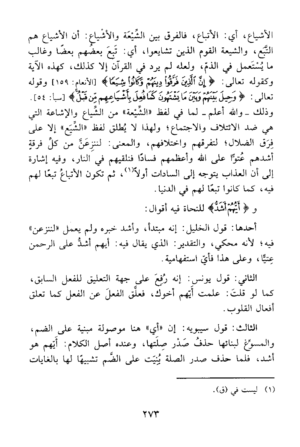 وكقوله من الذين فرقوا دينهم وكانوا شيعا الروم 132 وقوله وحيل بينهم وبين ما يشتهون كما فعل بأشياعهم من قبل سبأ 54 وذلك والله أعلم لما في لفظ الشيعة من الشياع والإشاعة التي هي ضد الإئتلاف والإجتماع ولهذا لا يطلق لفظ الشيع إلا على فرق الضلال لتفرقهم واختلافهم والمعنى لننزعن من كل فرقة أشدهم عتوا على الله وأعظمهم فسادا فنلقيهم في النار وفيه إشارة إلى أن العذاب يتوجه إلى السادات أولا ثم تكون الأتباع تبعا لهم فيه كما كانوا تبعا لهم في الدنيا