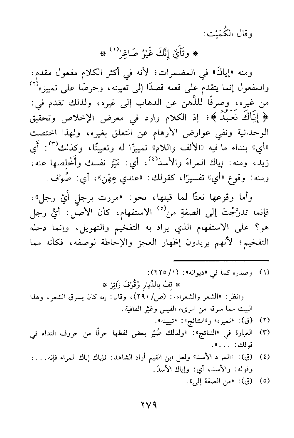 وتأي إنك غير صاغر ... ومنه إياك في المضمرات لأنه في أكثر الكلام مفعول مقدم والمفعول إنما يتقدم على فعله قصدا إلى تعيينه وحرصا على تمييزه عن غيره وصرفا للذهن عن الذهاب إلى غيره ولذلك تقدم في إياك نعبد إذ الكلام وارد في معرض الإخلاص وتحقيق الوحدانية ونفي عوارض الأوهام عن التعلق بغيره ولهذا اختصت أي بنداء ما فيه الألف واللام تمييزا له وتعيينا وكذلك أي زيد ومنه إياك المراء والأسد أي ميز نفسك وأخلصها عنه