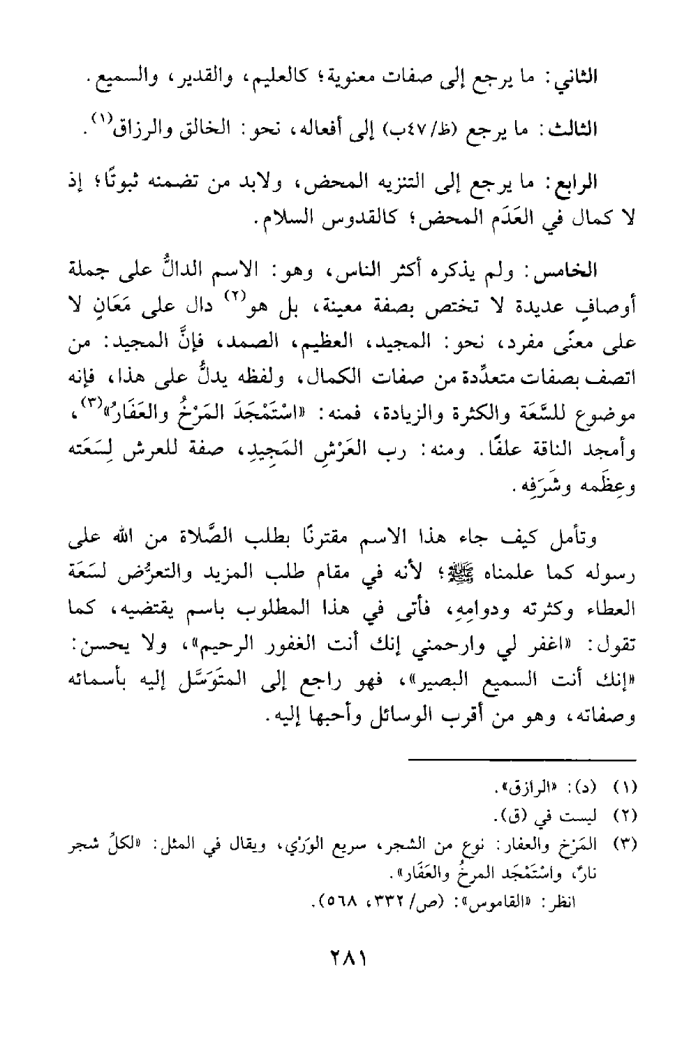 الثالث ما يرجع إلى أفعاله نحو الخالق والرزاق