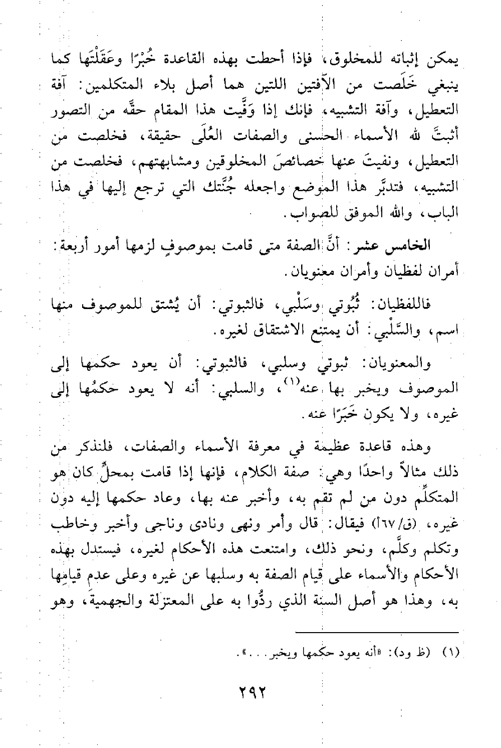 الخامس العشر أن الصفة متى قامت بموصوف لزمها أمور أربعة أمران لفظيان وأمران معنويان