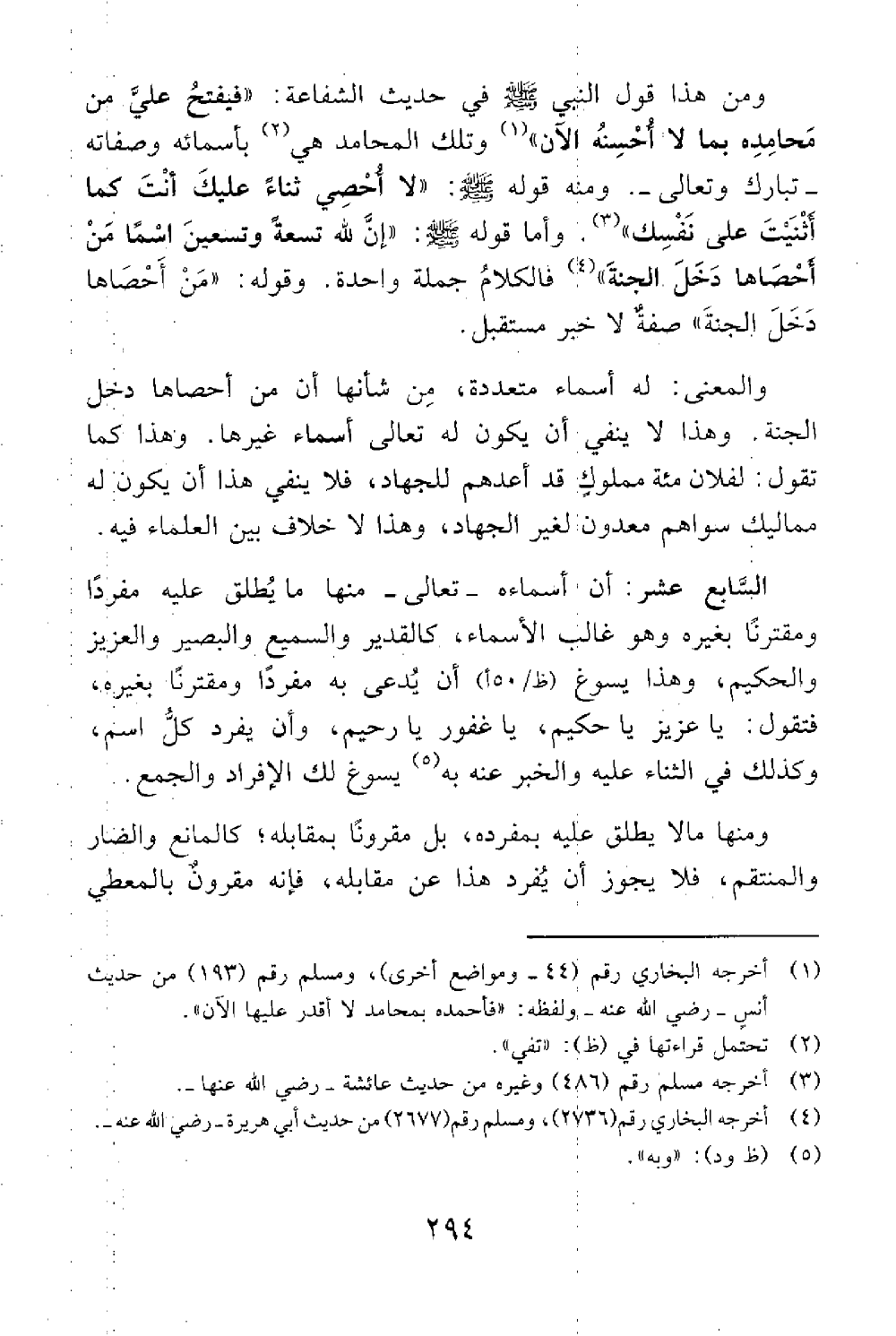 ومن هذا قول النبي في حديث الشفاعة فيفتح علي من محامده بما لا أحسنه الآن // رواه البخاري ومسلم // وتلك المحامد تفي بأسمائه وصفاته